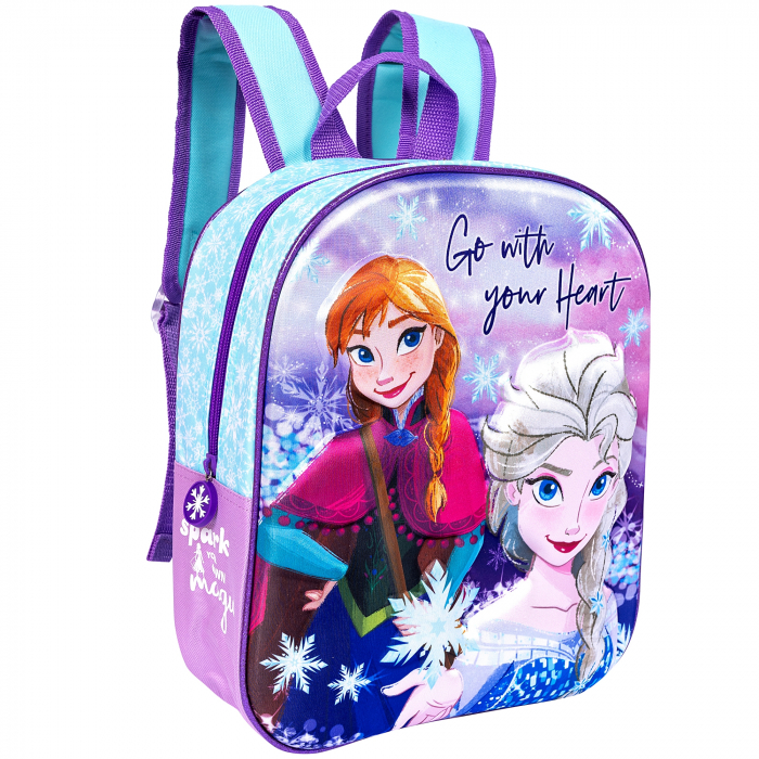 Ghiozdan 3D Frozen 2 cu 1 compartiment mare prevazut cu fermoar, 1 buzunar lateral, bretele buretate si reglabile. Fermoarul este accesorizat cu personajele in miniatura.