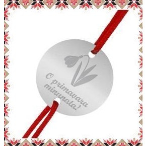 Bratara martisor realizata din Argint 925 Sterling, prevazuta cu pandantiv rotund cu finisaj satinat si model floral gravat. Designul este minimalist, cu perforatii laterale pentru prinderea sigura a snurului textil rosu traditional.