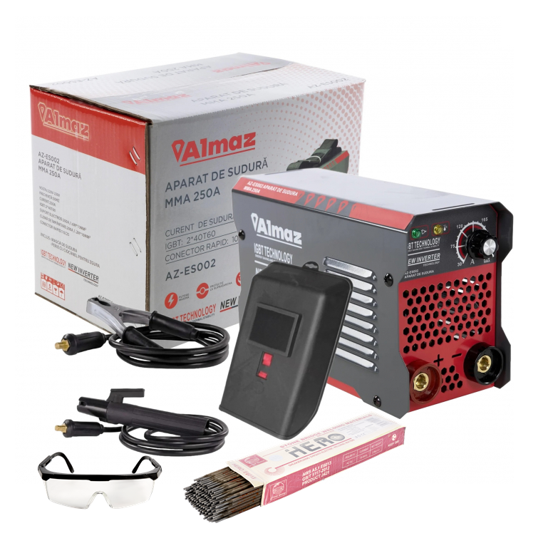 Aparatul de sudura MMA 250, Almaz AZ-ES002 este un transformator de curent ce sudeaza cu arc electric folosind electrozi acoperiti MMA ce pornesc arcul electric prin contact.