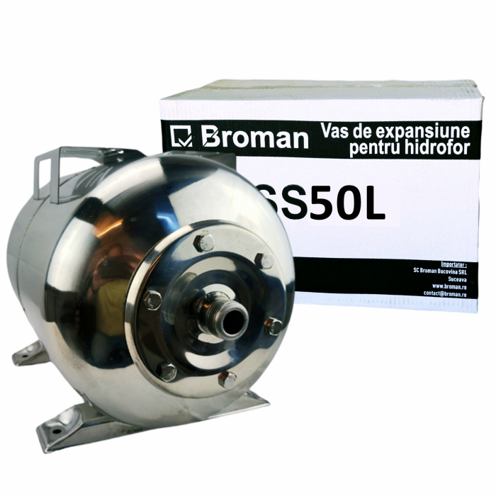 Bazin hidrofor Broman 50 litri este un vas de hidrofor orizontal cu membrană din cauciuc sau numit și vas de expansiune.