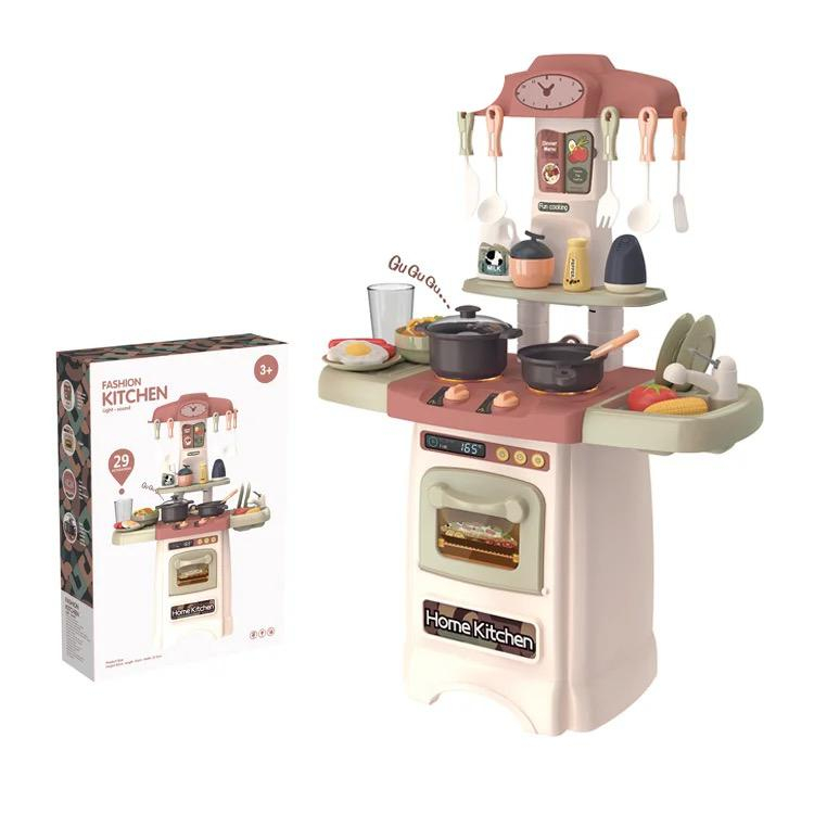 Bucatarie multifunctionala, cu aragaz, cuptor si chiuveta, 29 piese Bucatarie de jucarie electronica cu diferite functii si accesorii. 	Bucataria de jucarie dezvolta indemanarea, imaginatia si creativitatea fetitelor, care vor fi incantate sa imite activitatile pe care le fac cei mari in bucatarie; 	Bucataria contine o multime accesorii utile pentru gatit, precum: cratita cu capac, oala, ustensile, alimente; 	Plita aragazului are 2 ochiuri pe care pot fi asezate cele 2 cratite; 	Bucataria necesita 6 baterii 1.5 V, care nu sunt incluse;Jocul de rol este unul dintre jocurile preferate si foarte educative pentru copii, in special pentru cei mici. Aceste jucarii, realizate din plastic de buna calitate, in culori frumoase si vii, permit atat fetelor cat si baietilor, sa experimenteze activitatile casnice intr-un mod cat se poate de sigur.Bucataria contine sunete si lumini.Material: Plastic durDimensiune: 45 cm lungime x 21.5 latime x 62 inaltimeVarsta recomandata: 3ani+