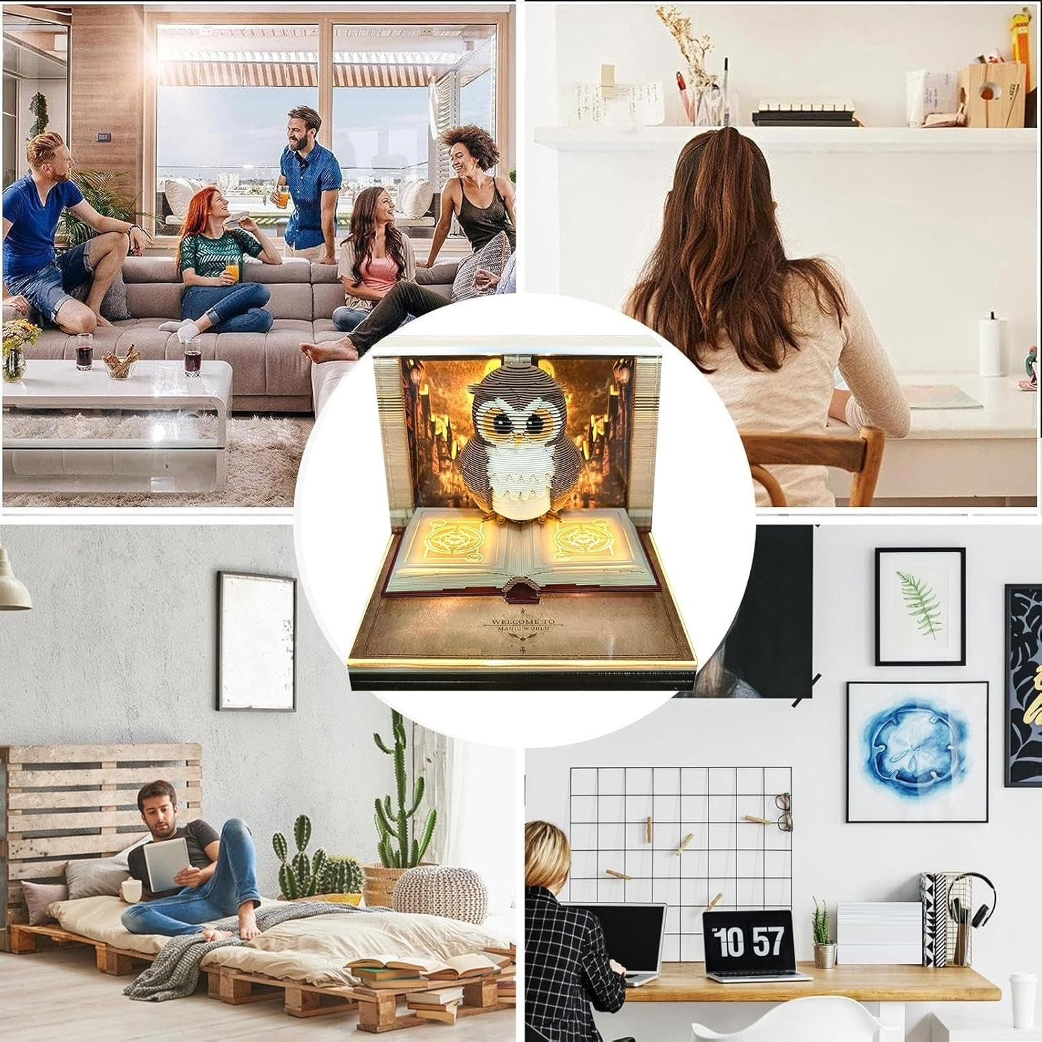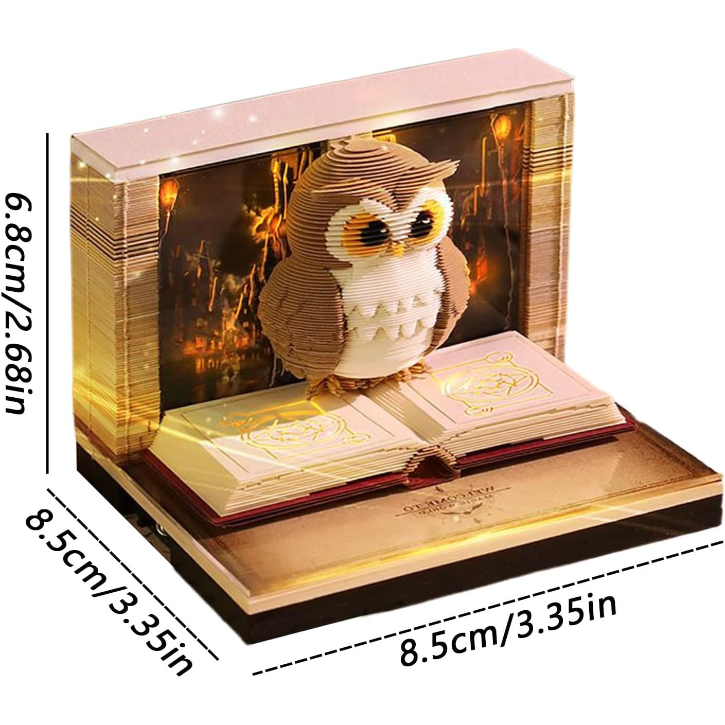 Calendarul interactiv 3D Flippy 2026 este mai mult decat un simplu calendar – este o piesa decorativa spectaculoasa pentru birou sau camera copiilor. Conceput sub forma unei sculpturi 3D tip carte, calendarul dezvaluie o bufnita din universul Magic World, iluminata cu luminite LED calde, care creeaza o atmosfera magica si relaxanta.