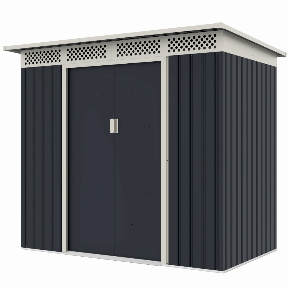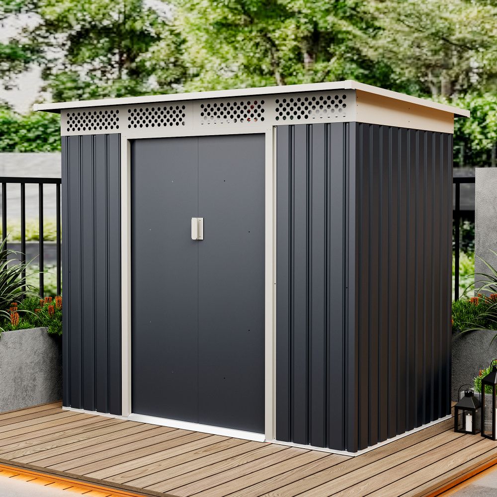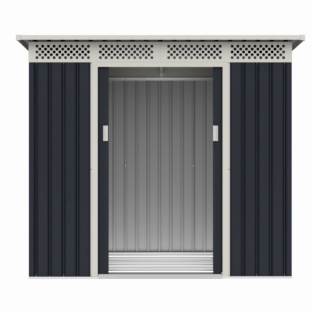 Casuta / magazie de gradina premium metalica, MESTERINO Bella-A, Gri/Bej, dimensiuni 215x142x184 cm, cu usi culisante si baza metalica