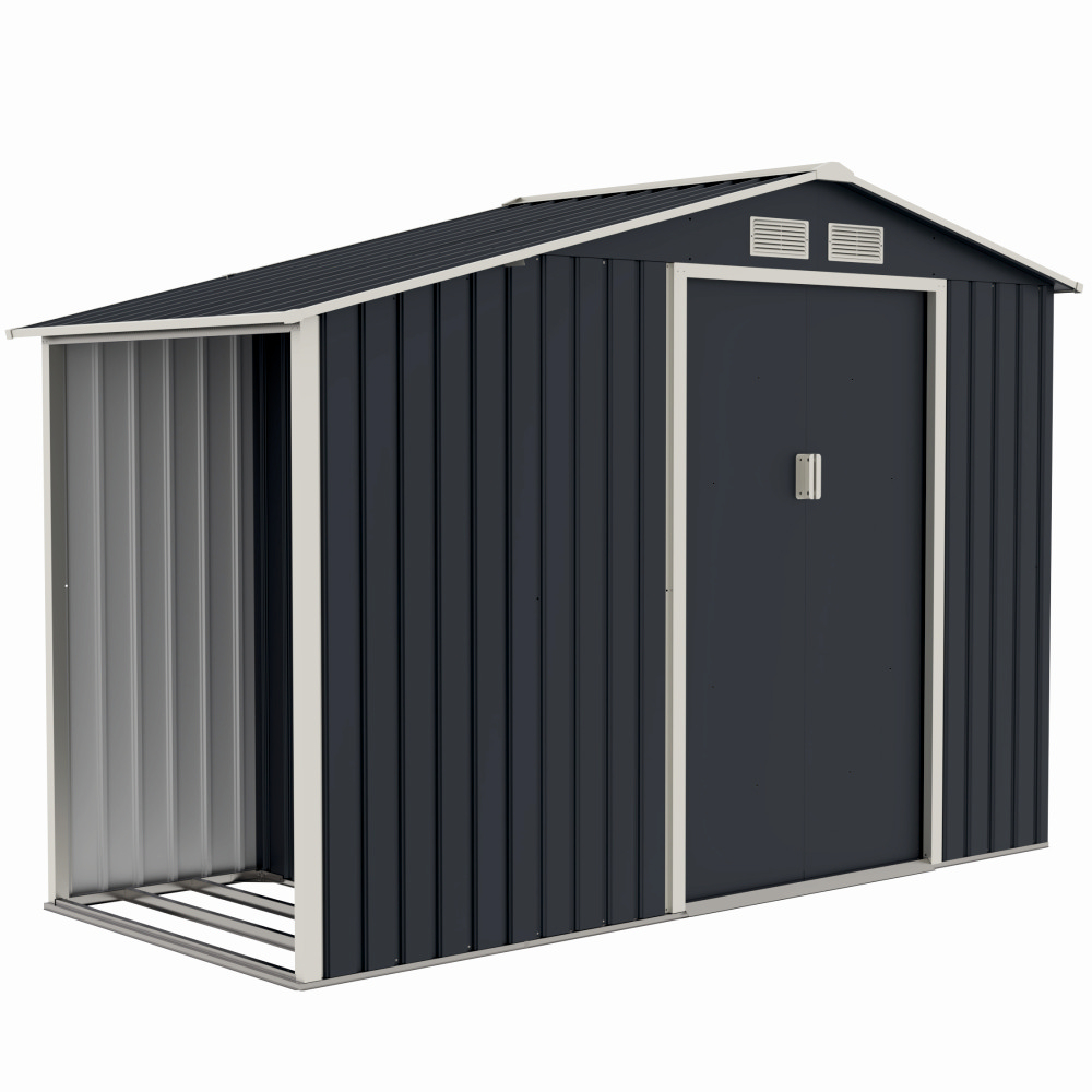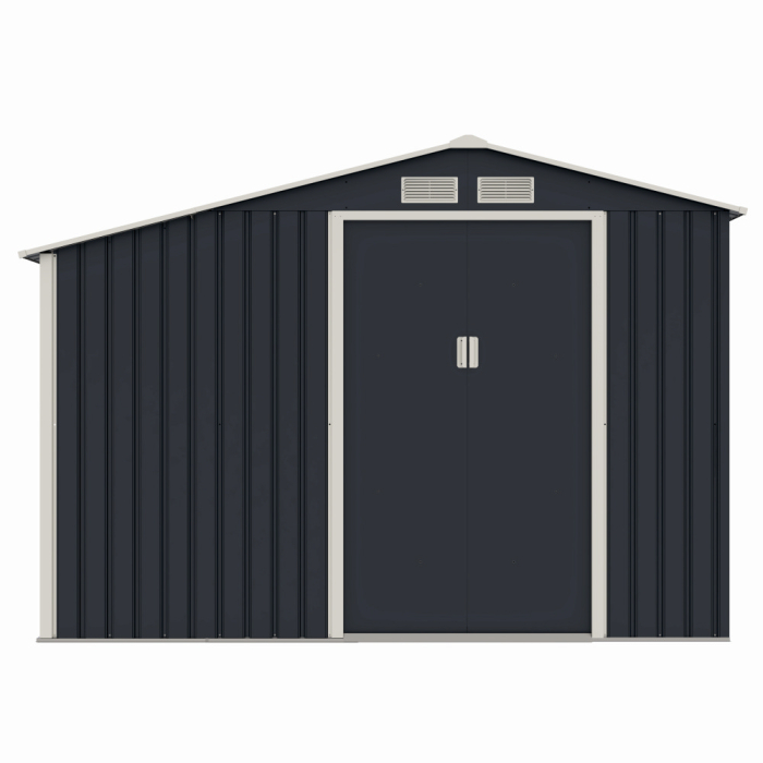 Casuta / magazie de gradina premium metalica, MESTERINO Luke-A, Gri/Bej, dimensiuni 278x131x195 cm, cu usi culisante si baza metalica