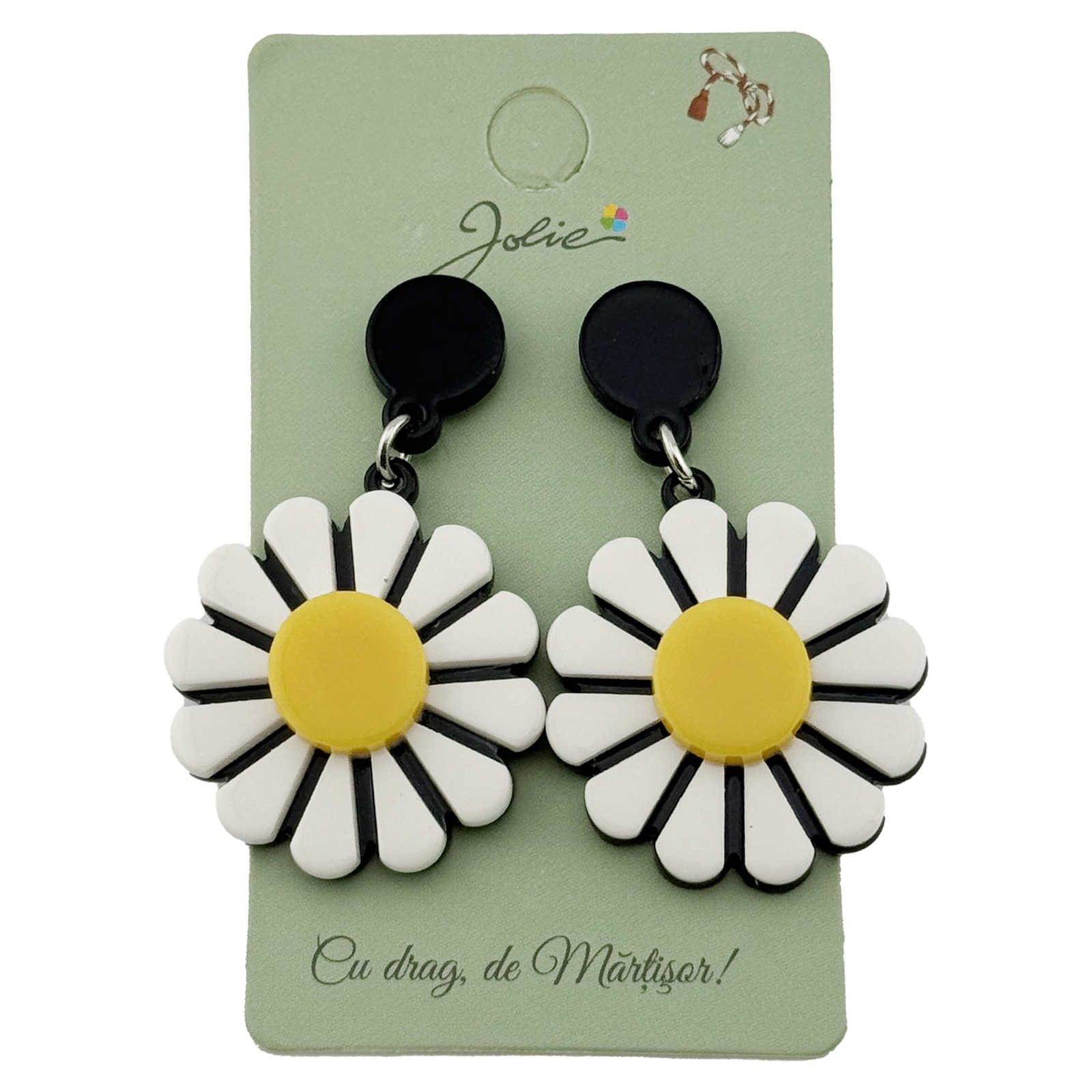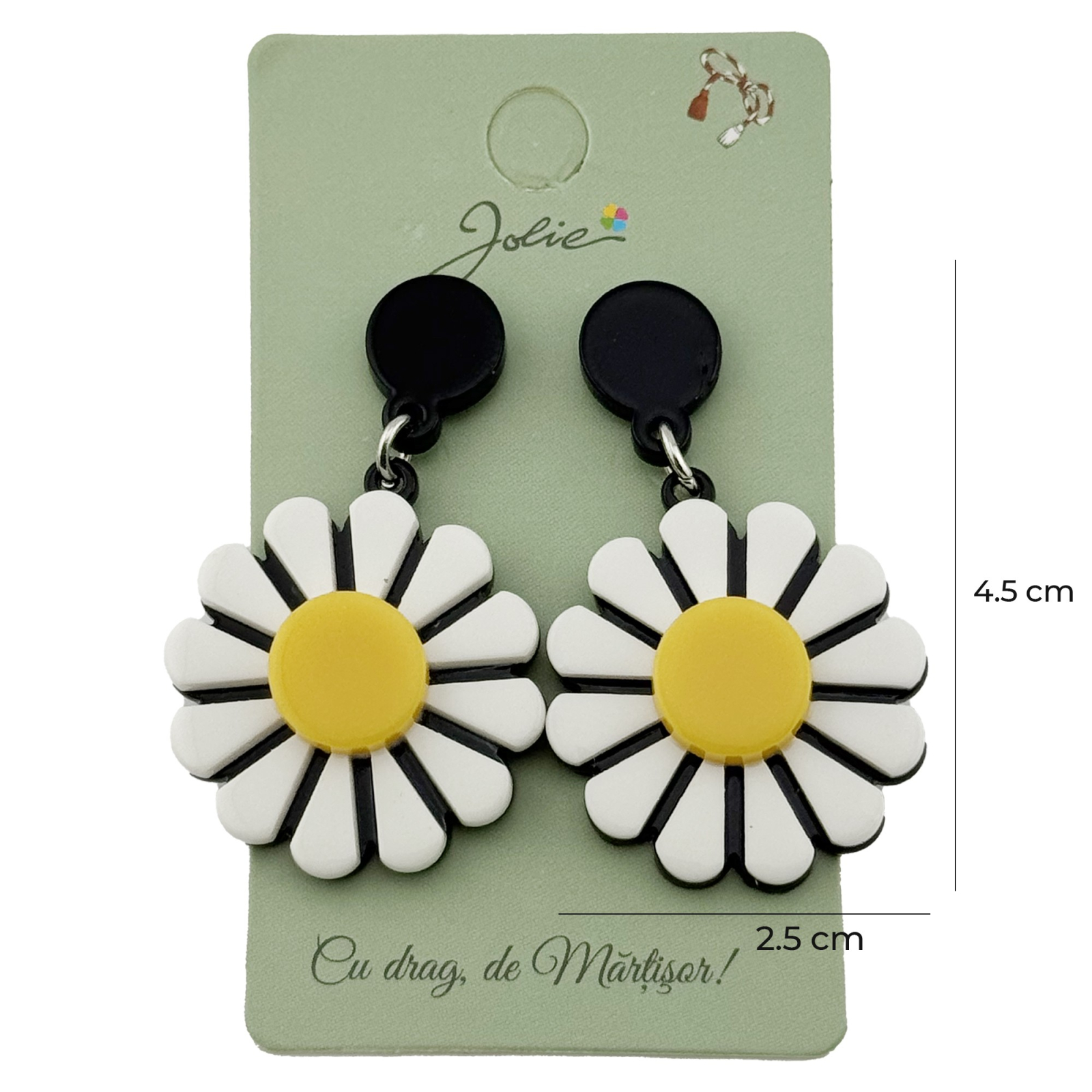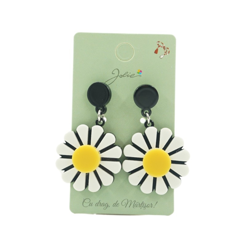 Adauga un plus de stil tinutelor tale cu acesti cercei eleganti, ideali pentru outfituri casual sau elegante. Designul modern combina forme margarete, oferind un aspect rafinat si feminin.