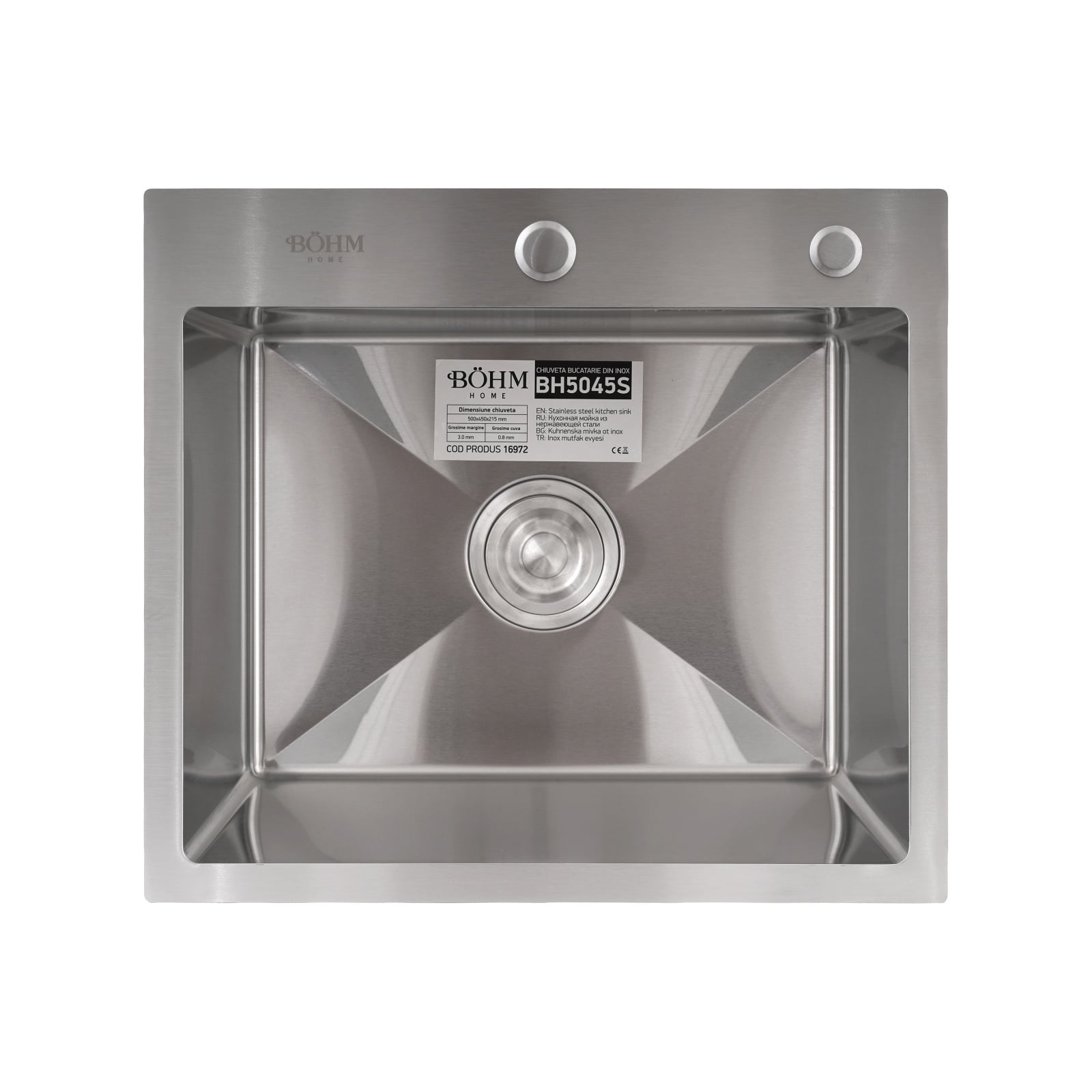 Grosimea materialului este optimizată pentru stabilitate: 0,8 mm pentru cuvă și 3,0 mm pentru margine, ceea ce oferă rigiditate și protecție împotriva deformării în timp. Modelul BH5045S se montează ușor și este compatibil cu majoritatea bateriilor și sifonărilor standard de pe piață, fiind o soluție practică pentru orice tip de bucătărie, fie ea modernă, clasică sau industrială.