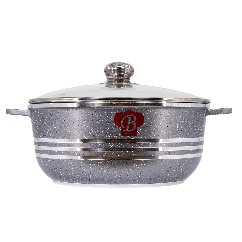 Oala minune, realizata stratificat de tipul ,,gros-subtire-gros'' impreuna cu baza perfect plata, permite distribuirea uniforma a caldurii, fapt ce asigura gatirea rapida si corecta pentru toate tipurile de alimente. Prepararea alimentelor se face cu cantitati minime de ulei. Ofera rezultate excelente la gatit atat la temperatura medie sau inalta de pana la 600 de grade, poate fi introdusa in cuptor, de asemenea invelisul neaderent faciliteaza curatarea usoara a vasului. Diametru: 28 cm Inaltime: 10cm Capacitate : 6,5 Litri Culoare interior : Gri cu aspect de piatra Culoare exterior: Gri cu aspect de piatra Capac: din sticla termorezistenta cu maner din inox Sursa de caldura: Gaz, Electric, Halogen Numar straturi de baza: 3 Instructiuni de folosire: A nu se folosi la interior ustensile din materiale metalice , pentru amestecarea alimentelor se vor folosi ustensile din silicon sau lemn, pentru curatare se vor folosi detergent de vase si burete neabraziv Numar bucati per set : 1 Continut pachet : 1x cratita cu capac 28 cm Material : Aluminiu turnat cu interior marmorat