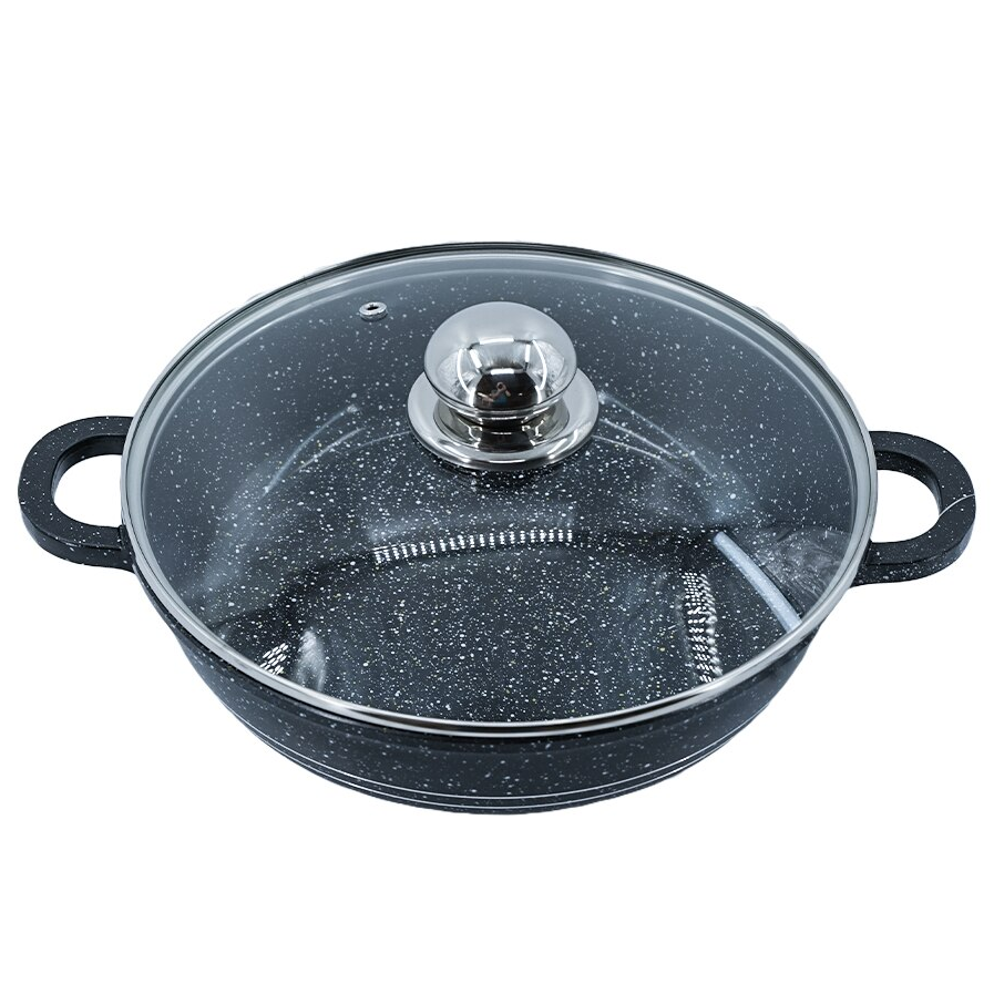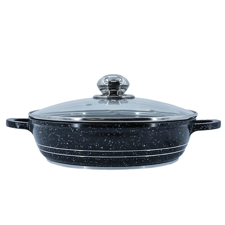 Oala minune, realizata stratificat de tipul ,,gros-subtire-gros'' impreuna cu baza perfect plata, permite distribuirea uniforma a caldurii, fapt ce asigura gatirea rapida si corecta pentru toate tipurile de alimente. Prepararea alimentelor se face cu cantitati minime de ulei. Ofera rezultate excelente la gatit atat la temperatura medie sau inalta de pana la 600 de grade, poate fi introdusa in cuptor, de asemenea invelisul neaderent faciliteaza curatarea usoara a vasului. Diametru: 24 cm Inaltime: 5cm Capacitate : 2.3 Litri Culoare interior : Negru cu aspect de piatra Culoare exterior: Albastru cu aspect de piatra Capac: din sticla termorezistenta cu maner din inox Sursa de caldura: Gaz, Electric, Halogen Numar straturi de baza: 3 Instructiuni de folosire: A nu se folosi la interior ustensile din materiale metalice , pentru amestecarea alimentelor se vor folosi ustensile din silicon sau lemn, pentru curatare se vor folosi detergent de vase si burete neabraziv Numar bucati per set : 1 Continut pachet : 1x cratita cu capac 24 cm Material : Aluminiu turnat cu interior marmorat Colectia : BLAUMANN FOR YOUR HOME