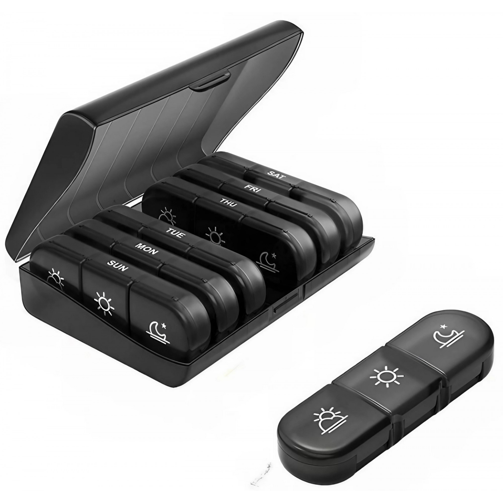 Cutie Depozitare Medicamente, Flippy, 7 Zile, 21 Compartimente, Cutie Suport, Recipiente Detasabile, Portabila, Negru, 15.6x12 cm