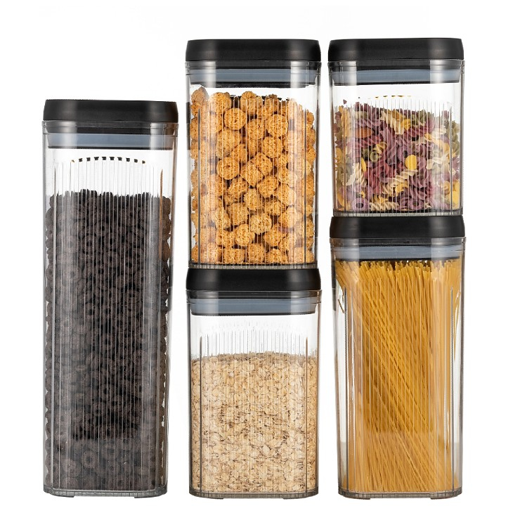 Cutii de Depozitare Alimente, Flippy, Set din 5 Cutii de tip Container, Recipiente pentru Cereale in Bucatarie, Transparente cu Capac Negru
