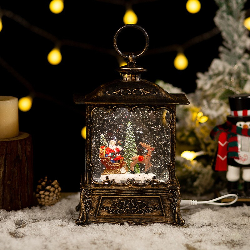 Design Vintage cu Moș Crăciun: Felinarul are un model elegant cu Moș Crăciun și sania sa, oferind un aspect clasic și nostalgic care îmbogățește orice decor de sărbători.