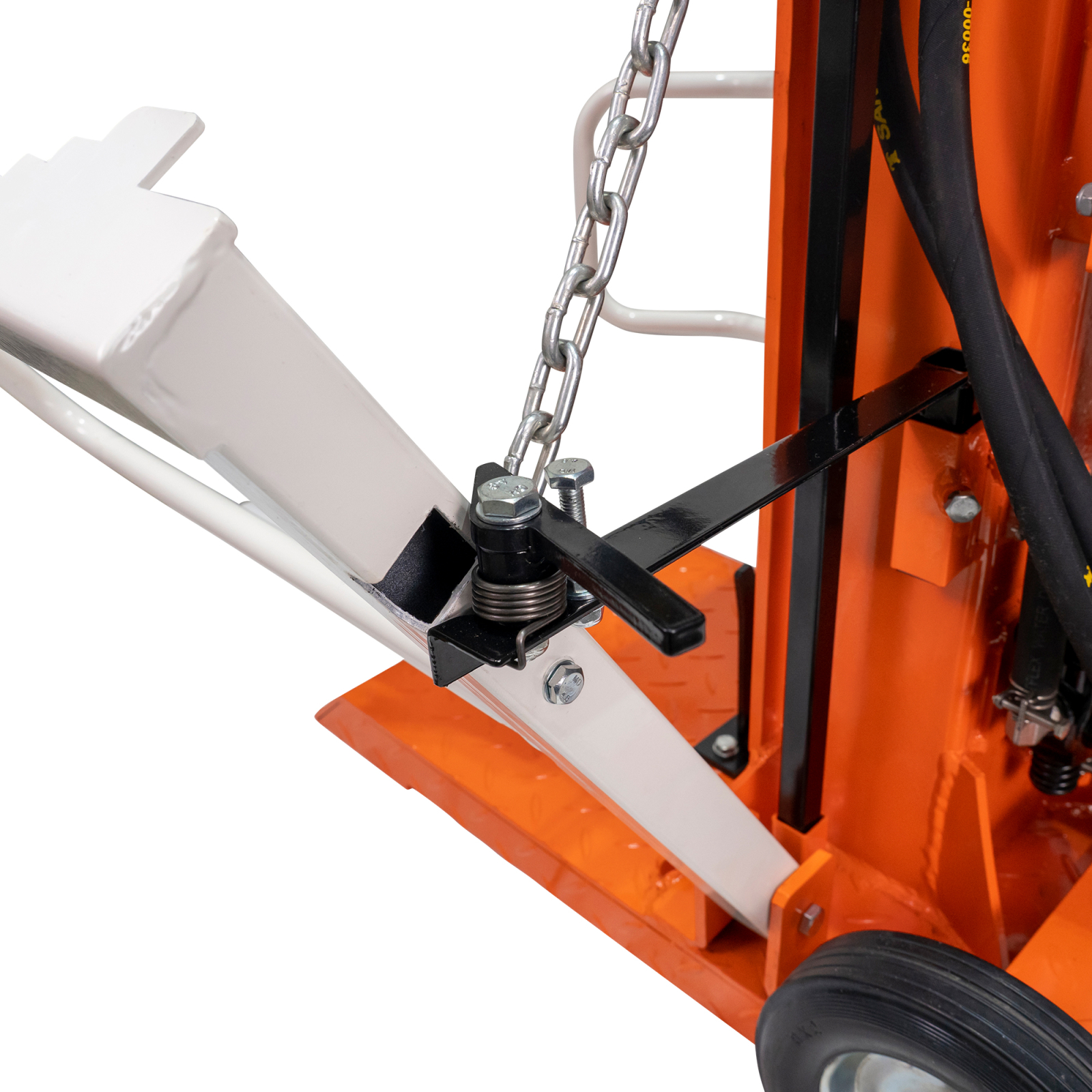 Despicatorul de lemne DLV1600AÂ este dotat cu un ansamblu de manere de operare cu cadru metalic pentru protectia mainilor si un maner de comanda pentru pana de despicare. Aceasta pana de despicare din otel tratat care culiseaza in jos si in sus pe un ghidaj de otel de tip sanie este situata pe axul cilidrului hidraulic._x000D_