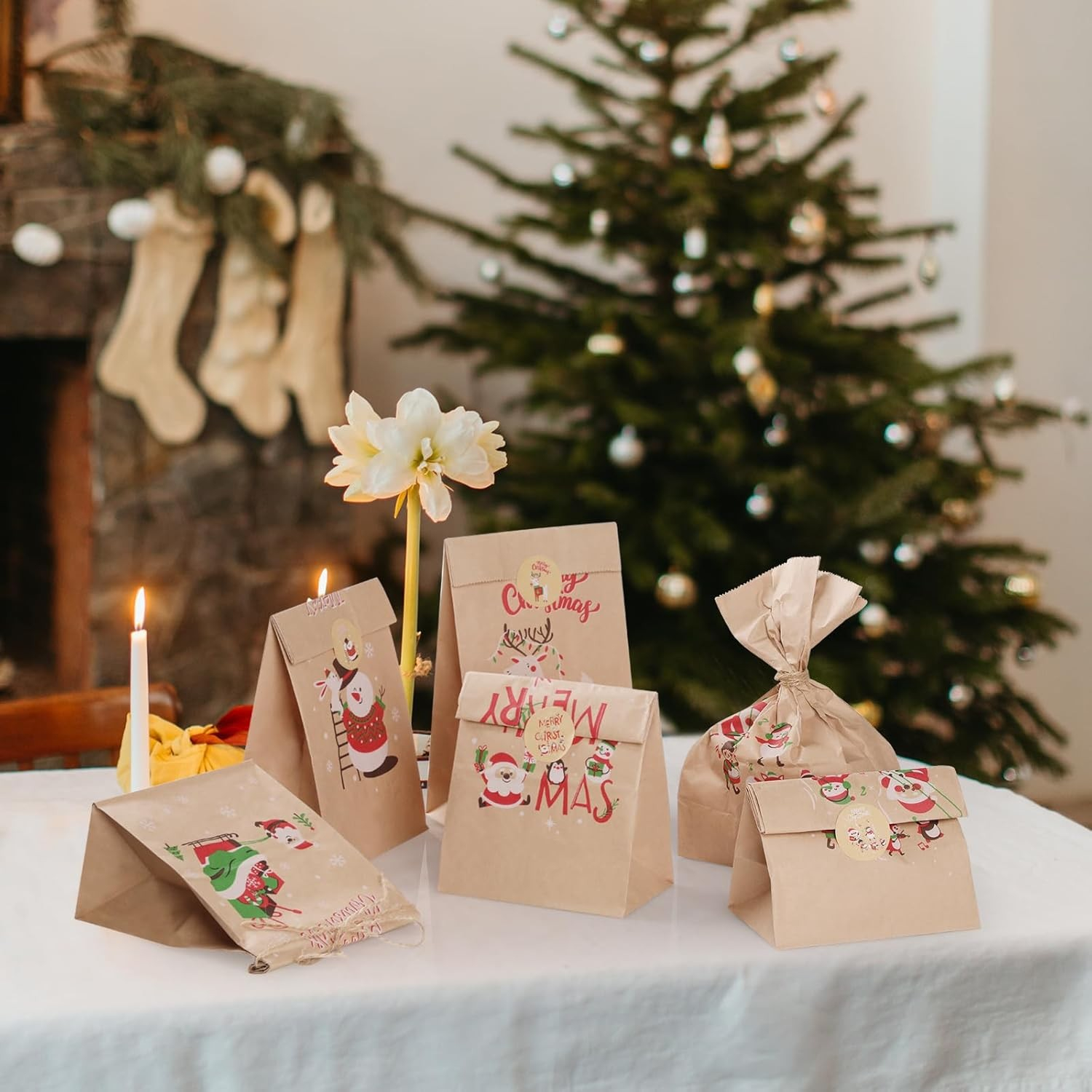 Set 12 Pungi de Cadou, Flippy®, Tematica Crăciun, 12 Stickere Incluse, 22 x 12 x 8 cm, din Hârtie, Maro
