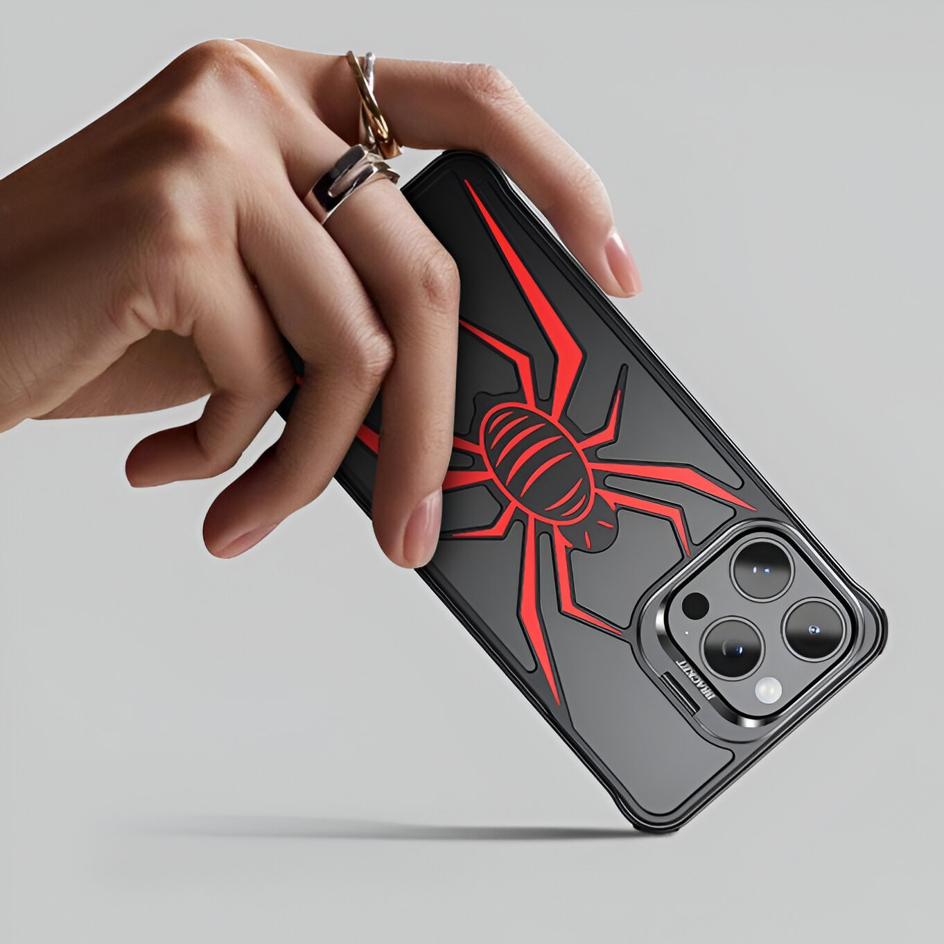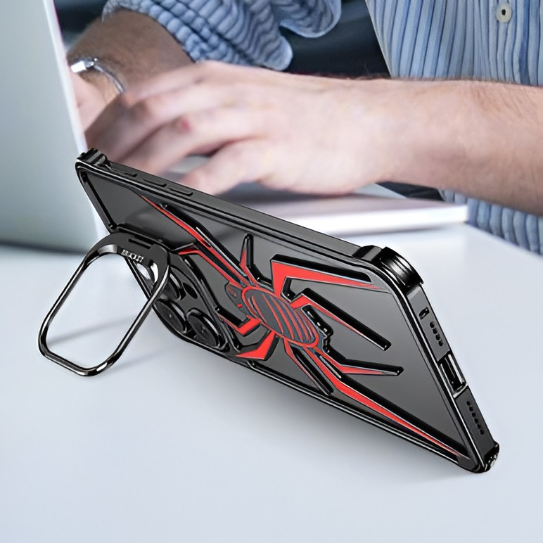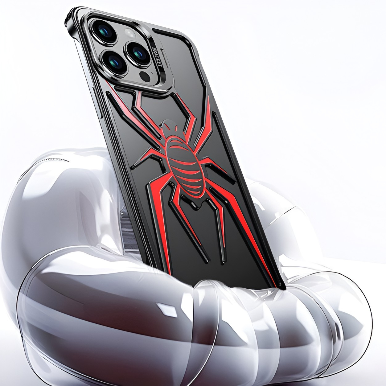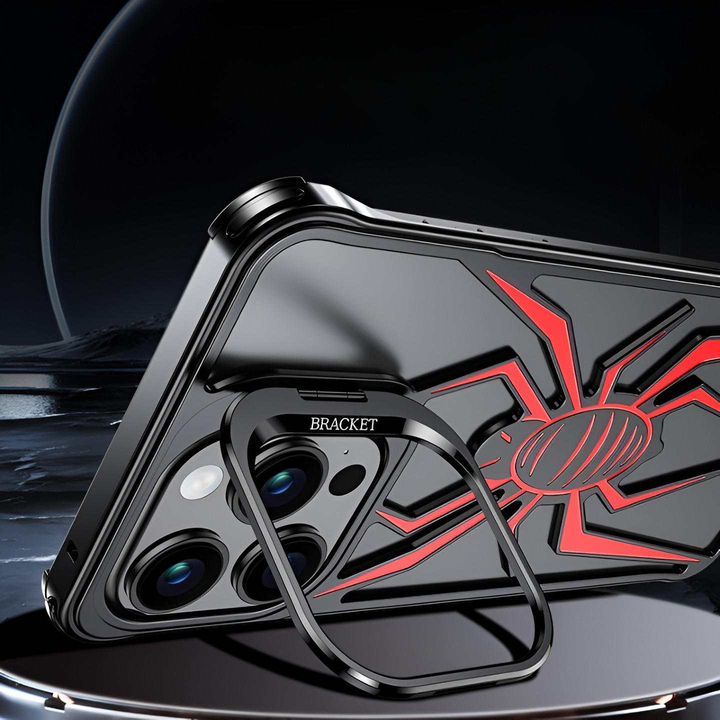 Husa de Protectie Compatibila iPhone 15 Pro, cu Suport Metalic pentru Camera, Armor Protective Series, Flippy, Antisoc, Protectie de Metal pe Margini, Model Paianjen, Negru Rosu