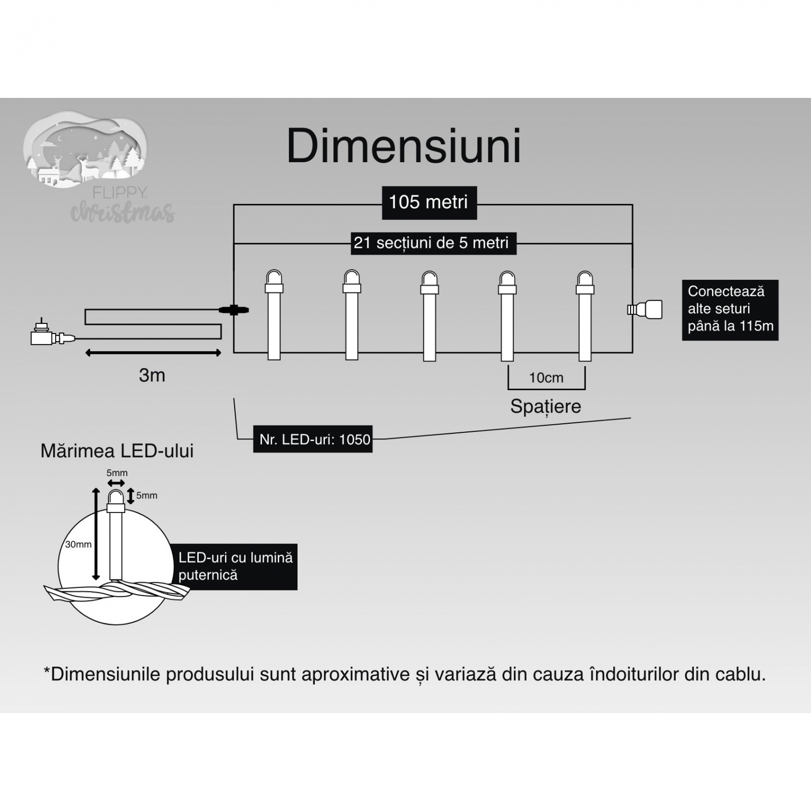 Instalatie Craciun, 105 m, 1050 Led-uri ,Liniara, Alb cald, 8 jocuri de lumini, Transformator cu telecomanda, Interconectabila, Prelungitor 3 m inclus, Fir Transparent, Flippy