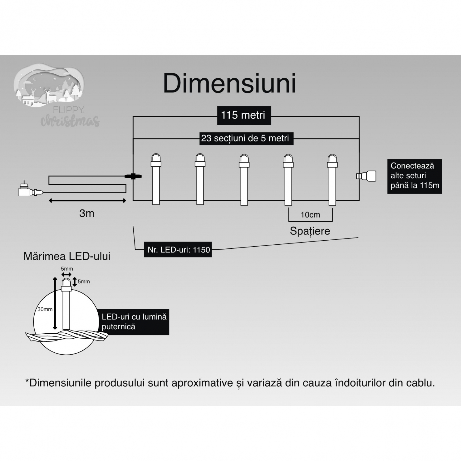 Instalatie Craciun, 115 m, 1150 Led-uri ,Liniara, Alb cald, 8 jocuri de lumini, Transformator cu telecomanda, Interconectabila, Prelungitor 3 m inclus, Fir Transparent, Flippy