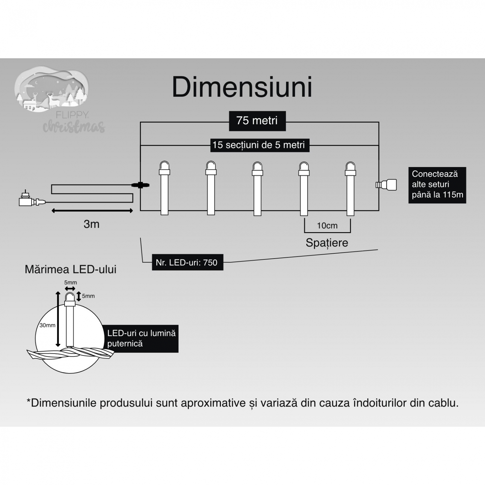 Instalatie Craciun, 75 m, 750 Led-uri ,Liniara, Rosu/Albastru/Rosu/Verde, Flash, Transformator, Interconectabila, Prelungitor 3 m inclus, Fir Verde, Flippy