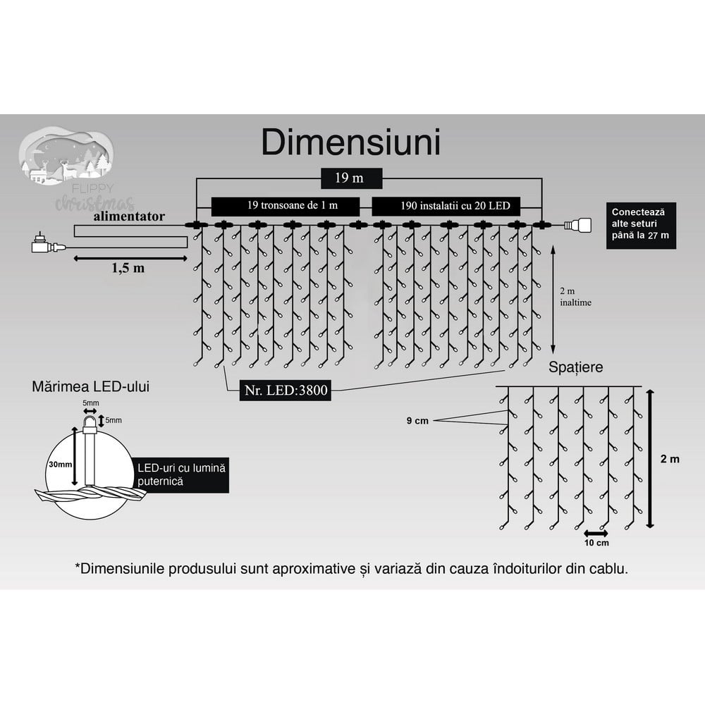 Suprafata luminoasa are un total de 19 metri. Lungimea totala a prelungitorului este de 1,5 metri. Ofera posibilitatea de a suspenda ghirlanda astfel incat sa poata fi ascuns cablul de alimentare atunci cand este conectat la priza.