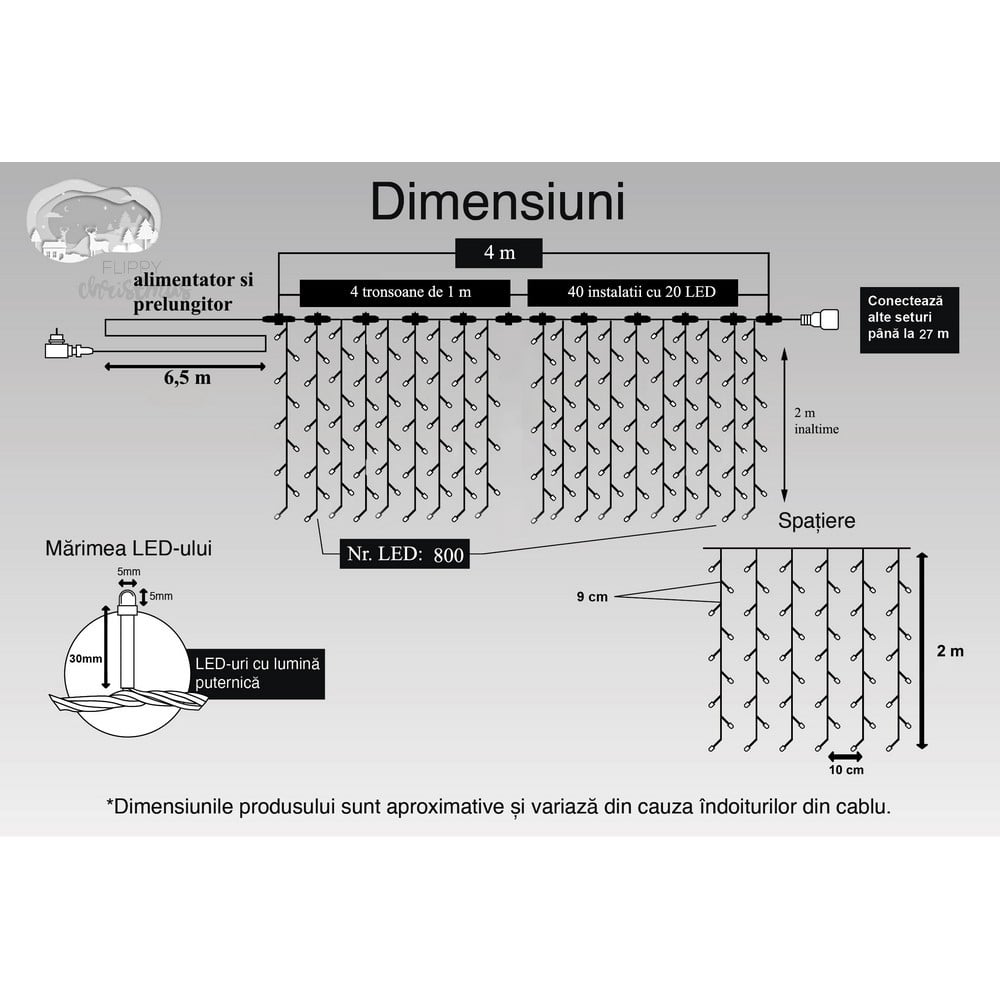 Suprafata luminoasa are un total de 4 metri. Lungimea totala a prelungitorului este de 6,5 metri. Ofera posibilitatea de a suspenda ghirlanda astfel incat sa poata fi ascuns cablul de alimentare atunci cand este conectat la priza.