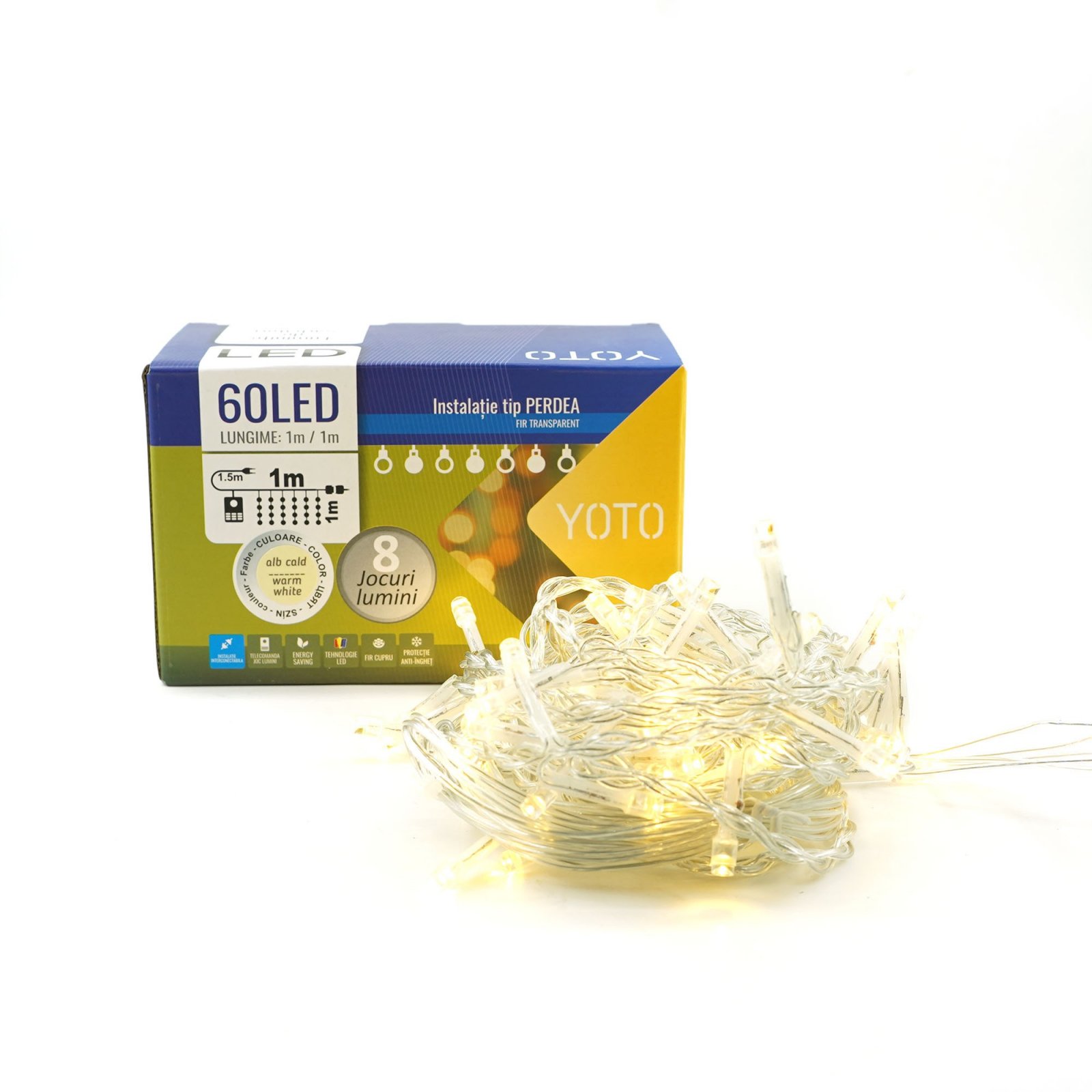 Cu dimensiunile sale impresionante de 1 metri în lungime și 1 metri înaltime, această instalație este alegerea perfectă pentru a crea o atmosferă de sărbătoare încântătoare, fie că este folosită în interior sau exterior. Cu un total de 60 de LED-uri luminoase, această perdea aduce cu sine strălucirea caldă a Crăciunului într-un mod captivant și fermecător.