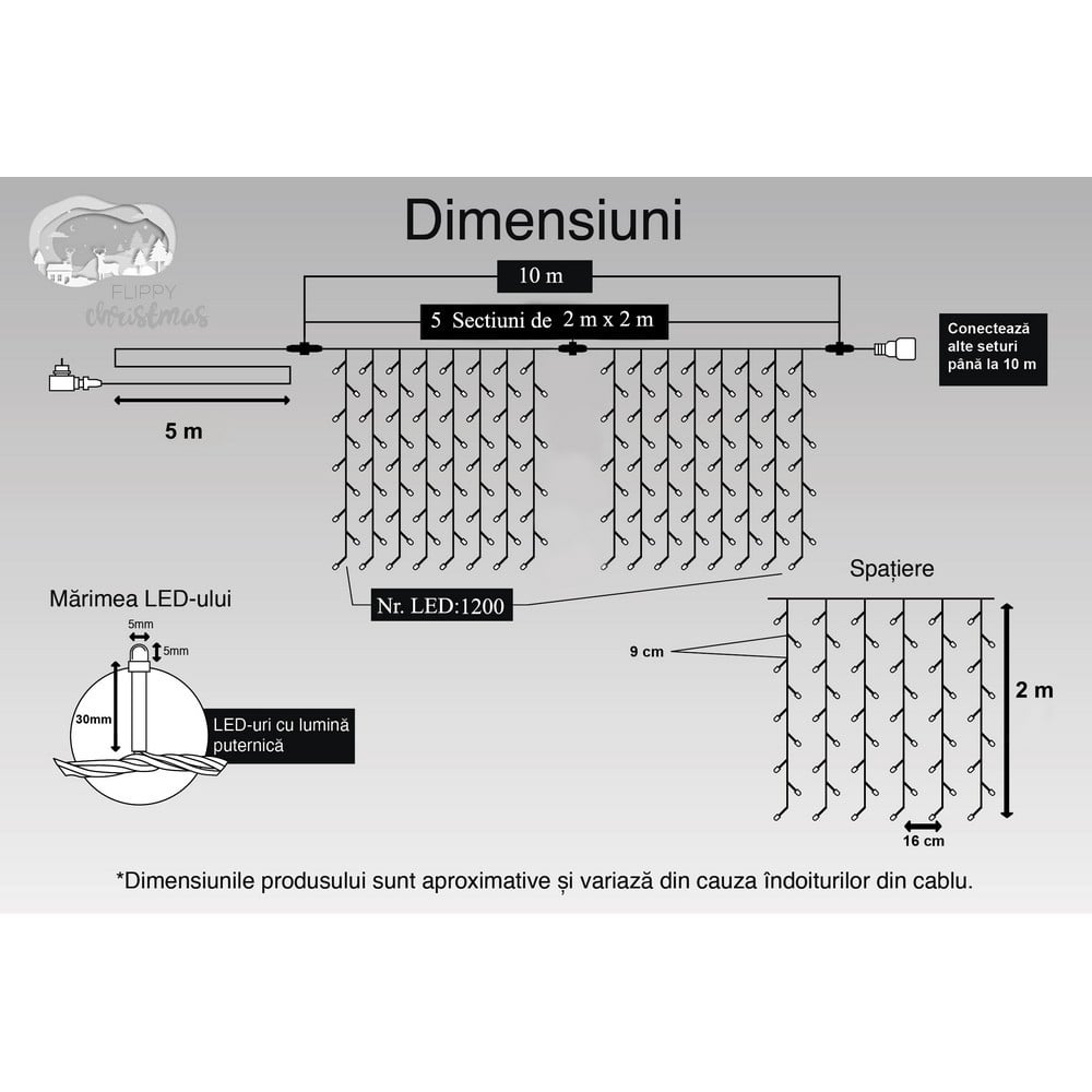 Instalatia luminoasa Flippy este de tip perdea si are 1200 LED-uri de culoare albastru, avand o lungime de 10 m, cu fir transparent realizat dintr-un plastic anti-inghet, iar firele electrice sunt fabricate din cupru.