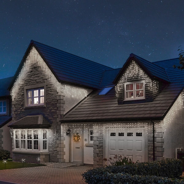 Instalatie Craciun Premium, IP65, Exterior, 225 m, Led-uri ,Franjuri, Turturi, Alb rece, Flash, Alimentator, Interconectabila, Fir Alb Cauciucat, 220v, Flippy