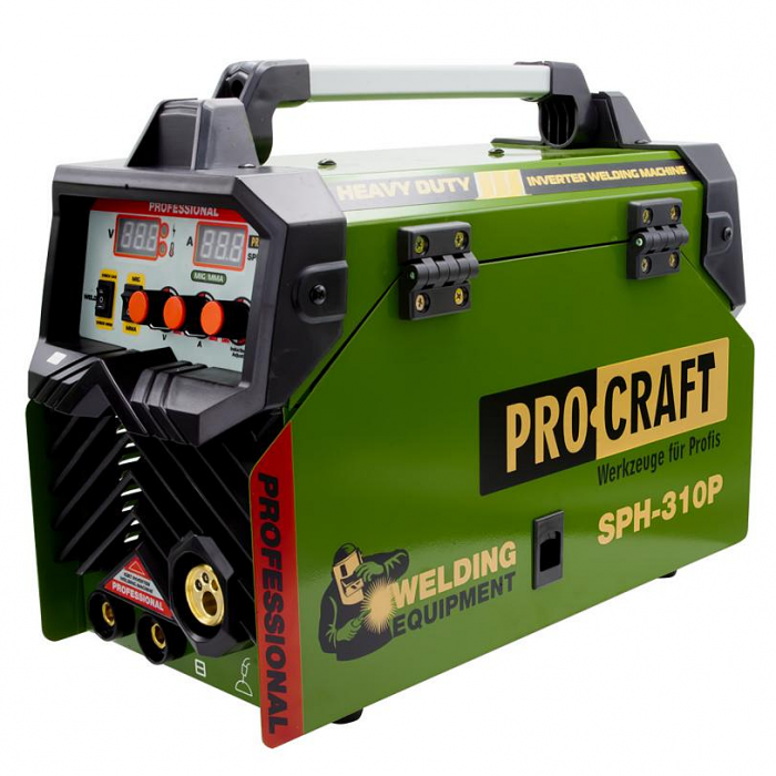 Procraft SPH310P este un aparat de sudură cu invertor de înaltă performanță care combină funcțiile unui invertor cu cele ale sudării semiautomate cu sârmă. Acest model este potrivit pentru aplicațiile de sudură casnice. Aparatul permite reglarea tensiunii și a curentului de ieșire. Eficiența de 85% este asigurată prin utilizarea unui tranzistor german robust. Există o funcție de răcire forțată și un control al curentului reglabil continuu.