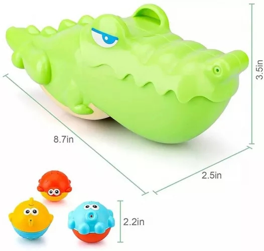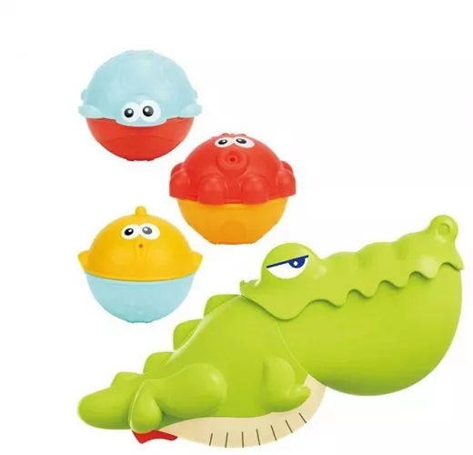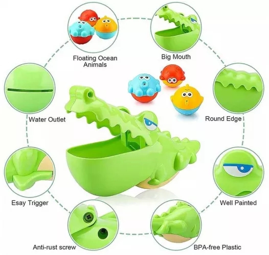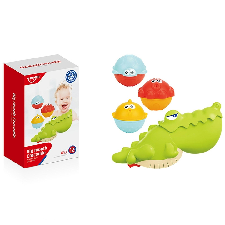 Creat de Huanger, ceea ce asigura calitate premium, acest crocodil stralucitor îsi deschide gura pentru a mânca bile în forma de broasca testoasa si pestisori.