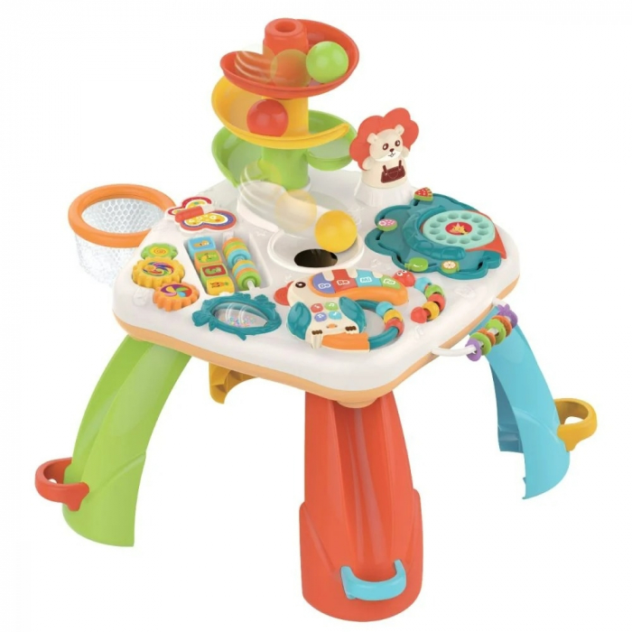 Distractia nu se termina niciodata la Masuta de joaca! Cu 11 activitati antrenante, bebelusul tau isi va dezvolta abilitatile motorii, muzicalitatea, coordonarea, atentia si cunostintele, totul in timp ce se joaca.