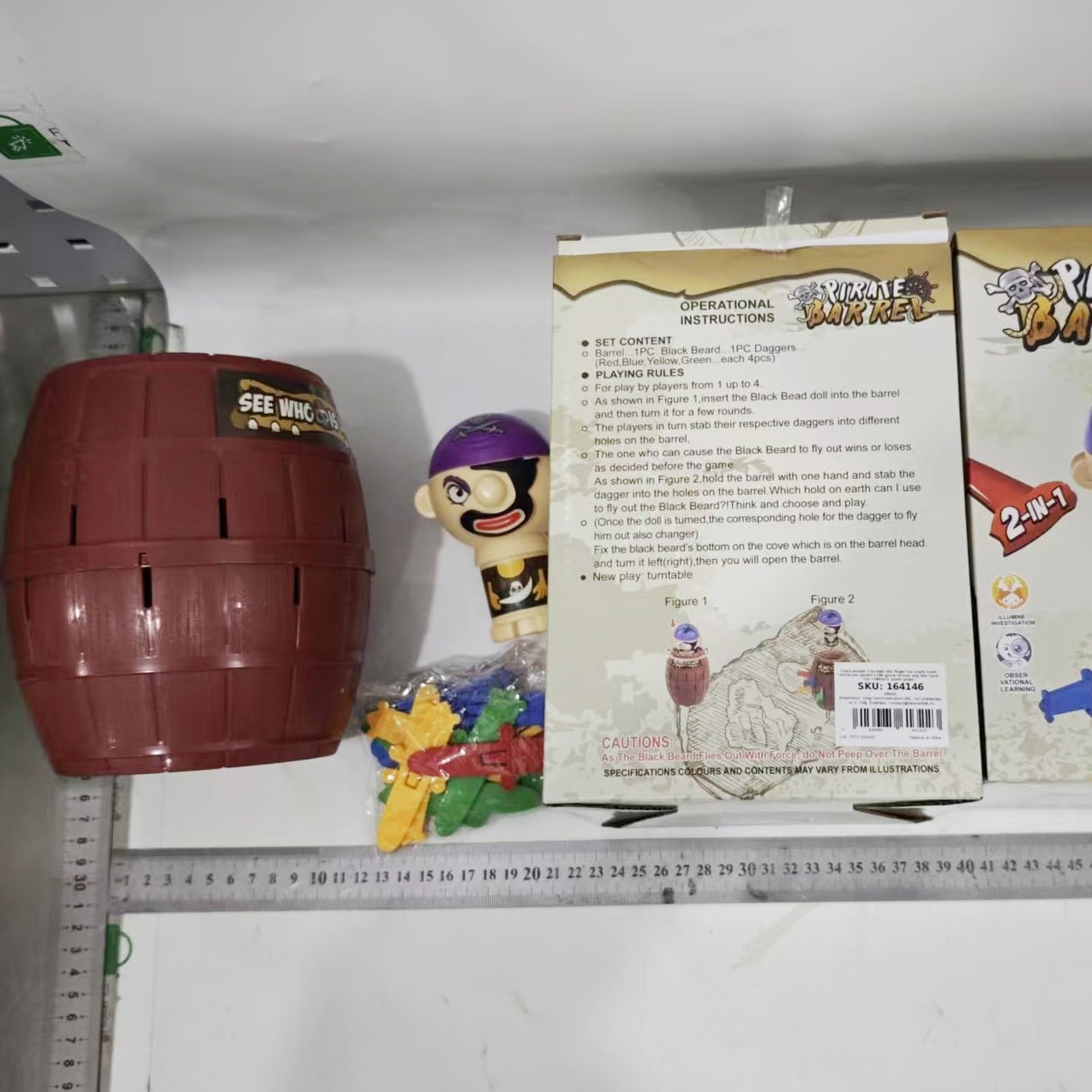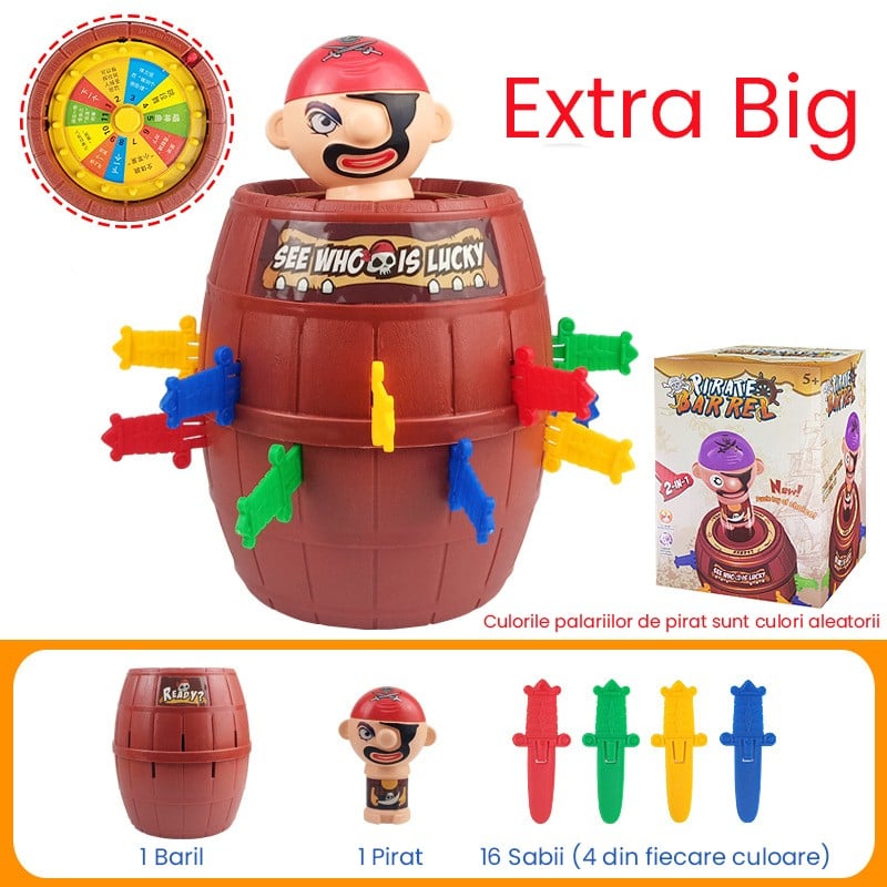 Introdu sabiile in butoias si ai grija – una dintre ele poate arunca Piratul! Cand este infipta sabie corecta, piratul brusc va fi aruncat. Jocul incurajeaza interactiunea, atentia si spiritul competitiv, fiind ideal pentru jocuri de grup.