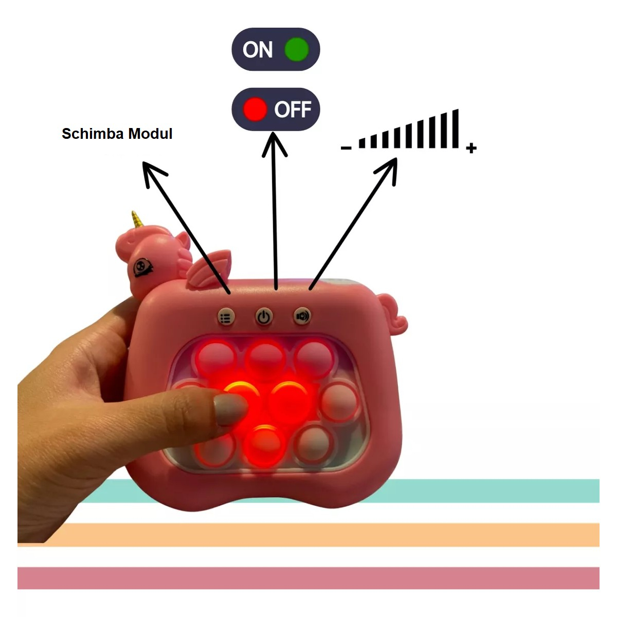 Descoperă jucăria interactivă Pop It Whack A Mole Flippy, model Unicorn, ce oferă 4 moduri de joc și funcții multiple, cum ar fi flash-ul și muzica, pentru a aduce distracția în viața micuților! Fabricată din ABS și silicon, această jucărie este ideală pentru copiii cu vârsta de peste 3 ani, contribuind la dezvoltarea abilităților practice și a coordonării mână-ochi. Distracție și stimulare senzorială garantată într-un singur produs compact și ușor de utilizat!