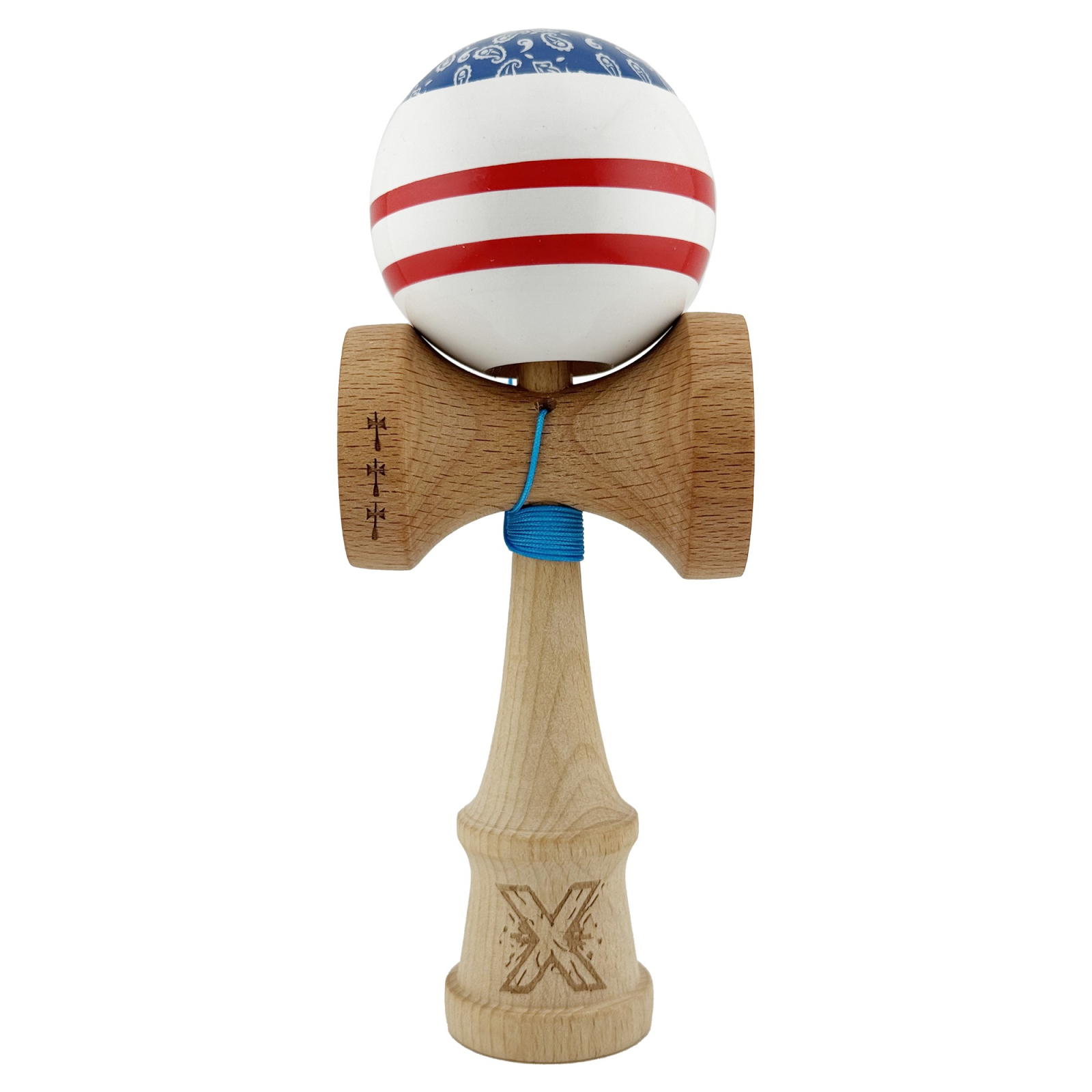 Kendama X CHICANOS Originala, Profesionala, Flippy, Big Cups V2, Super Sticky cu Cupe Mari, Rulment Metalic, din lemn 18 cm, Ata 55 cm, Albastru/Alb