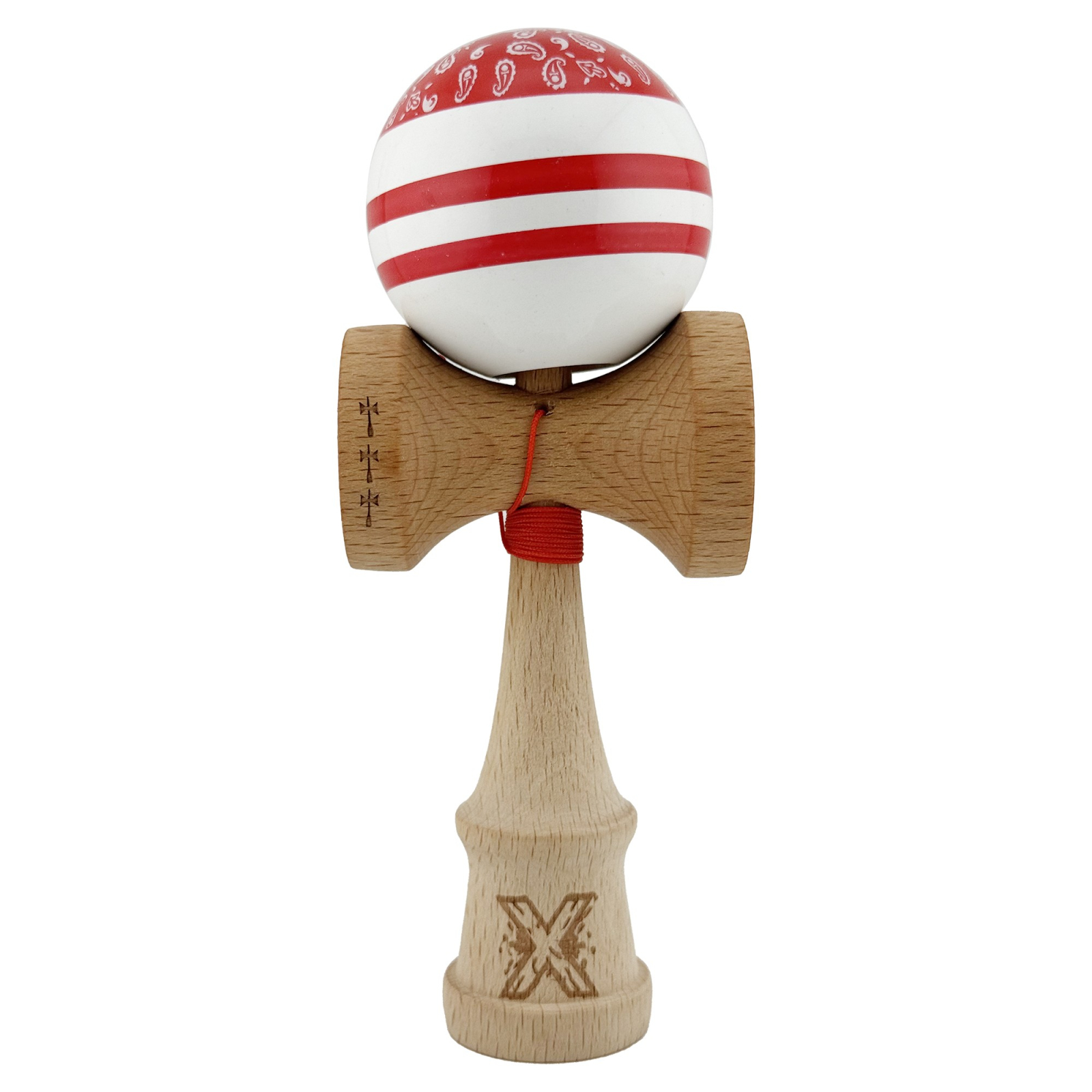 Kendama X CHICANOS Originala, Profesionala, Flippy, Big Cups V2, Super Sticky cu Cupe Mari, Rulment Metalic, din lemn 18 cm, Ata 55 cm, Rosu/Alb