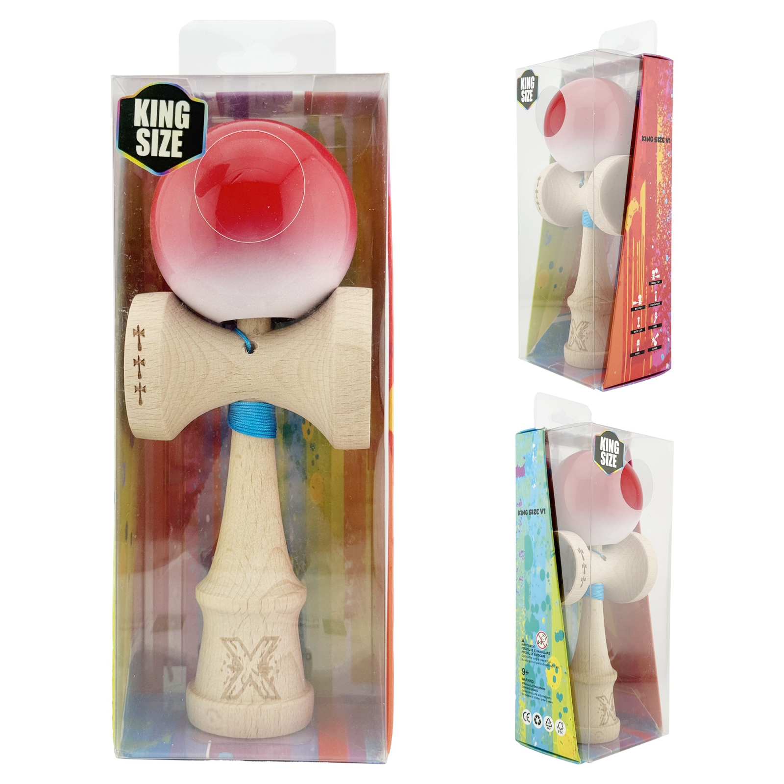 Kendama X Originala, Profesionala, Flippy, Big Cups V2, Super Sticky cu Cupe Mari, din lemn 18 cm, Rulment Metalic cu Ata 55 cm, Gradient Rosu/Alb