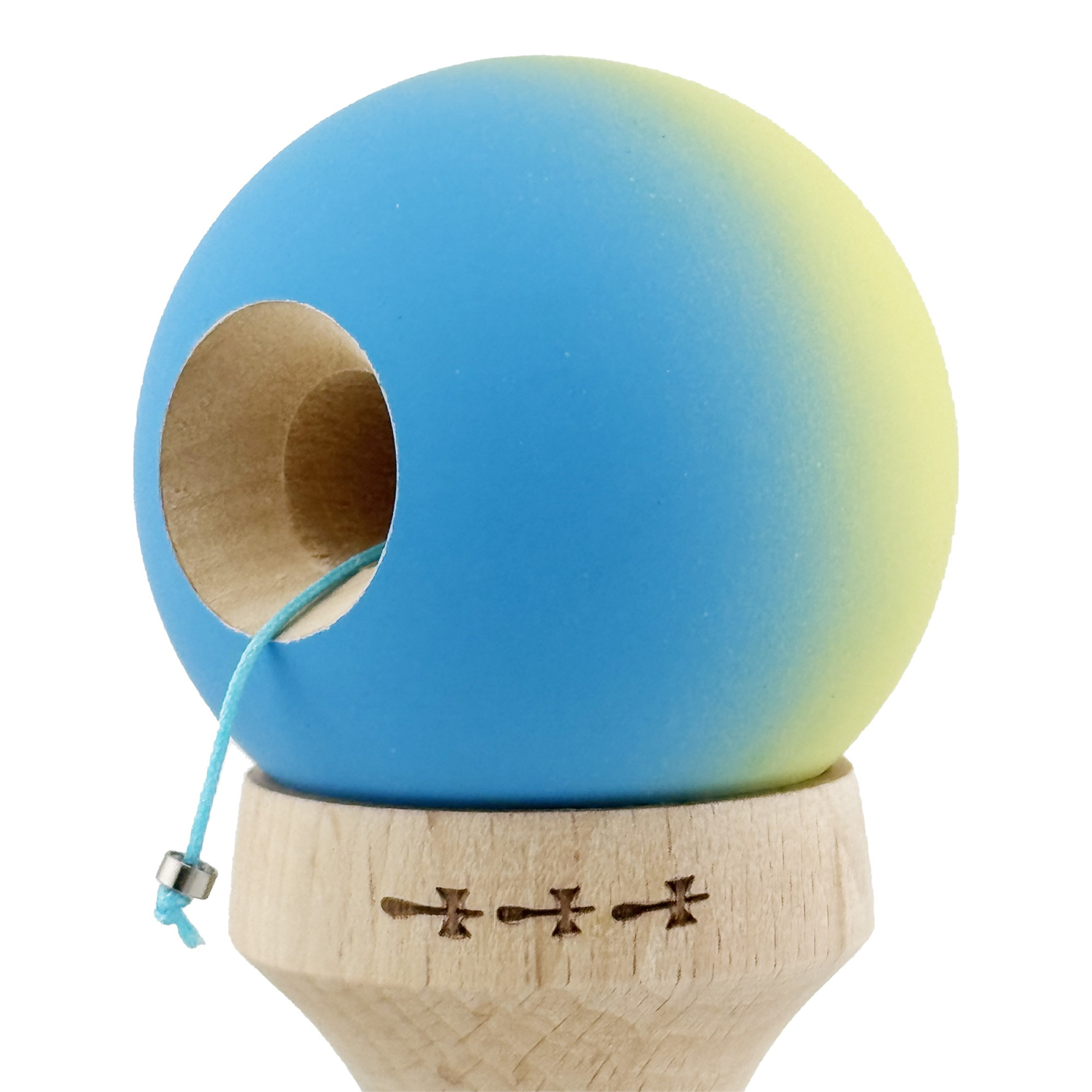 Kendama X Originala, Profesionala, Flippy, Cupe Mari KING SIZE V3, Rubber Grip, Gaura in Baza, Rulment Metalic, din lemn 18 cm, Ata 62/65 cm, Gradient Galben/Albastru deschis
