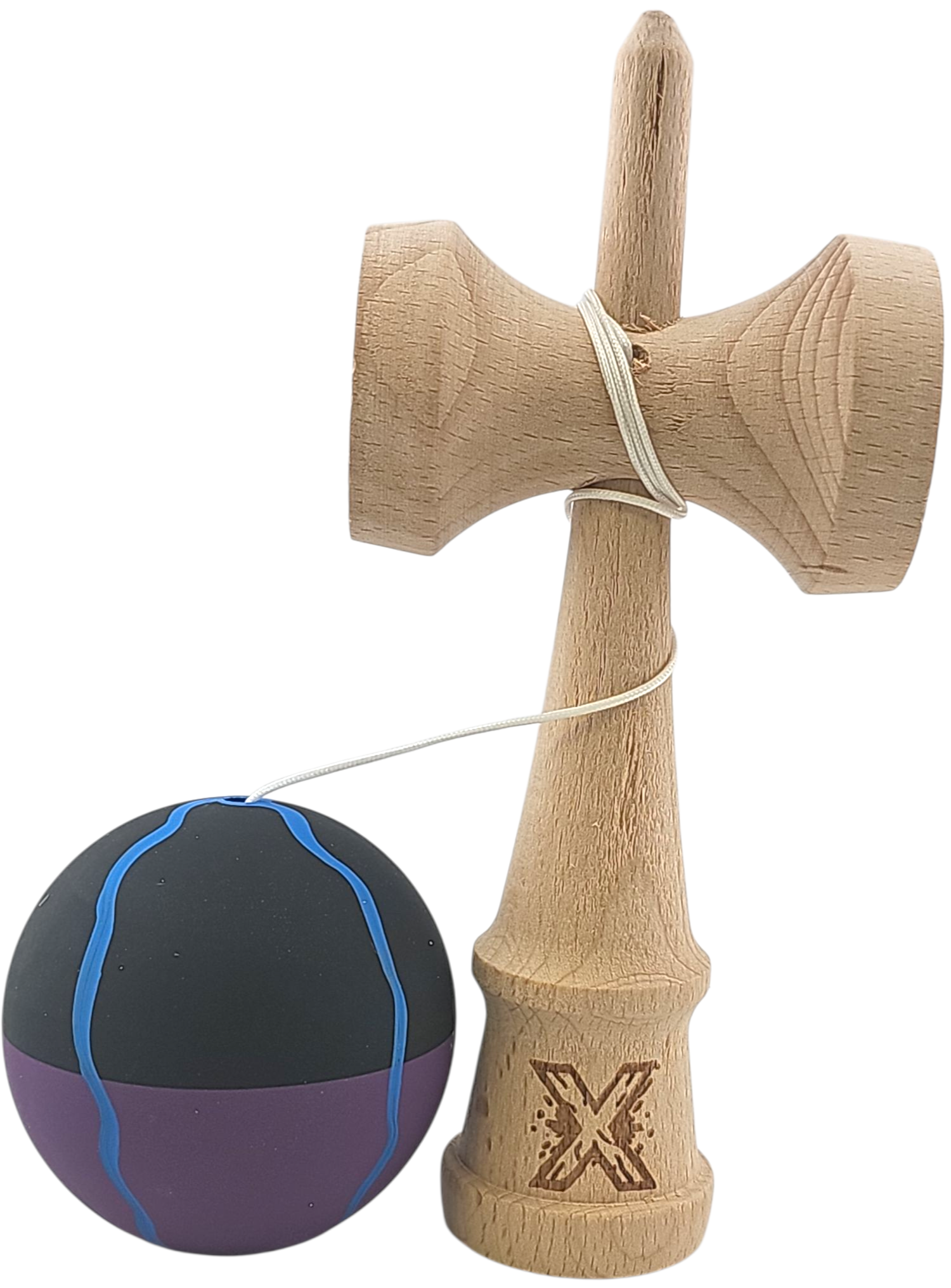Kendama X Originala, Profesionala, Flippy, din Lemn, Rubber Grip, 18 cm, Negru/Mov/Albastru