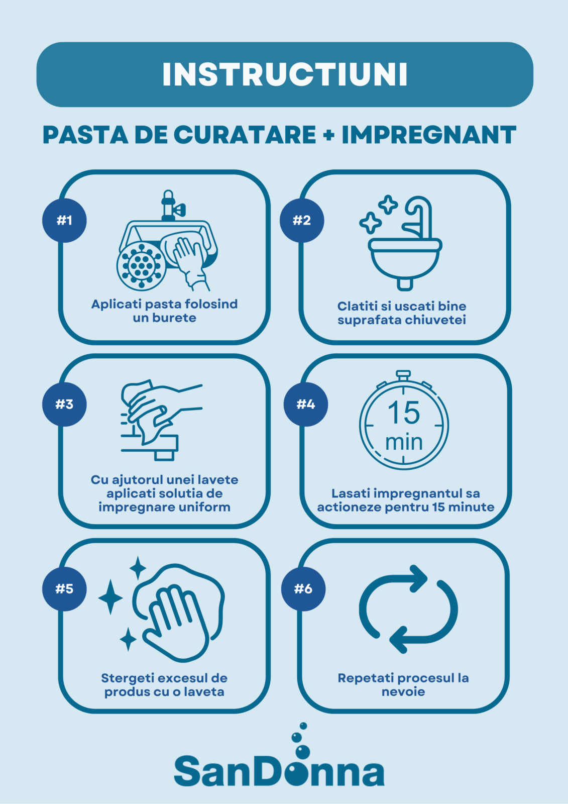 Solutie pentru curatat granit Sandonna mini Contine: -Pasta de curatare -Ulei impregnant Mod de utilizare: Curatati bine chiuveta cu pasta de curatare. Clatiti cu apa si uscati cu o laveta inainte de a folosi agentul de impregnare. Aplicati agentul de impregnare pe toata suprafata chiuvetei sa lasati sa actioneze pentru 10-15 minute pentru a se absorbi in materialul chiuvetei. Stergeti surplusul de produs. Repetati acest pas la nevoie. Daca apar mici zgarieturi, aplicati agentul de impregnare local pentru a le elimina.