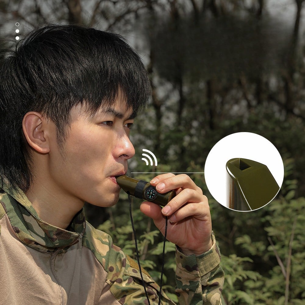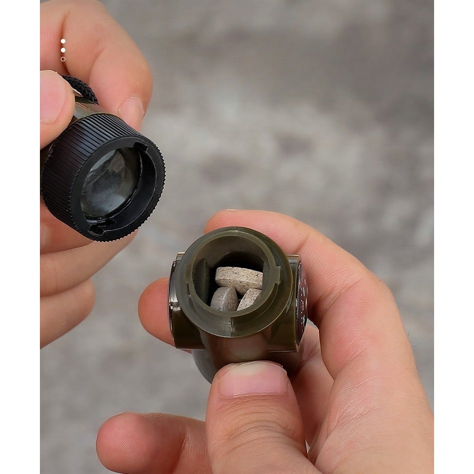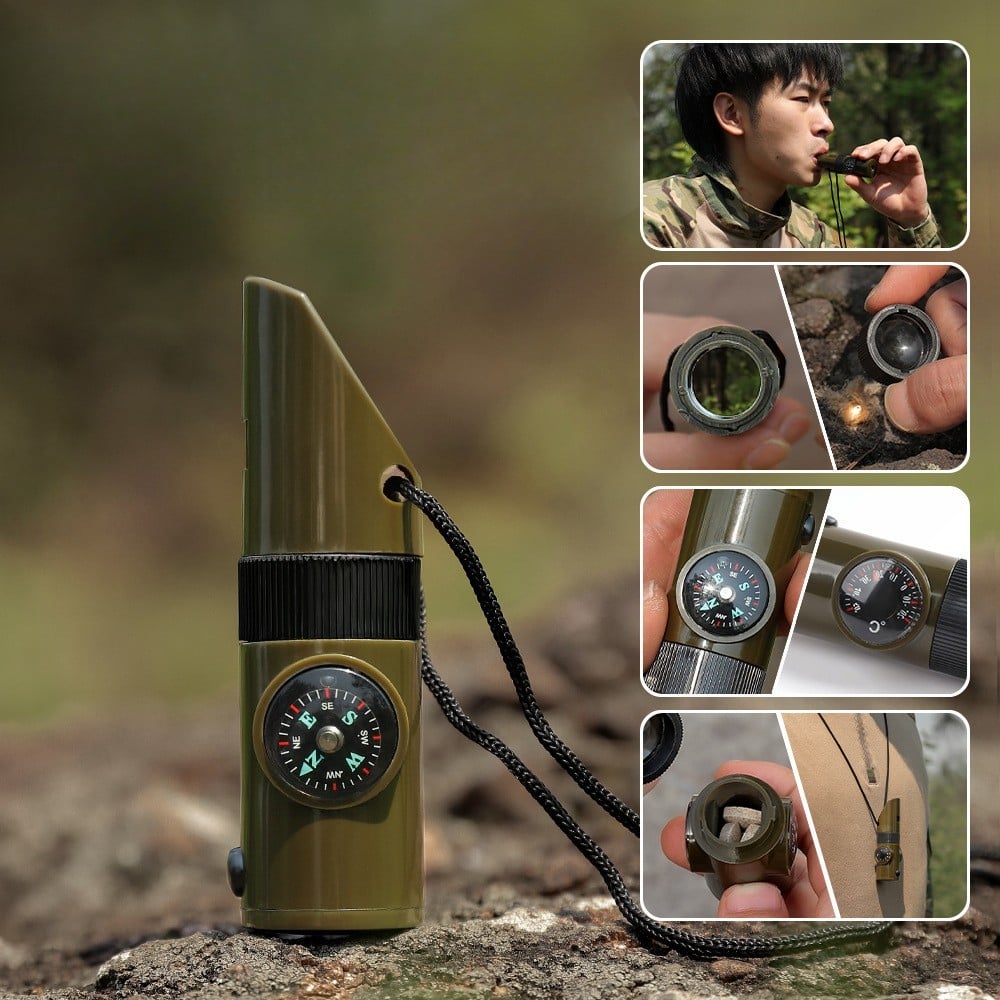 Versatilitatea: Acest produs combină șapte funcții diferite într-un singur dispozitiv compact. Indiferent dacă ești într-o drumeție, hiking sau alte activități în aer liber, ai la dispoziție o lupa, un fluier, un termometru, un compartiment pentru depozitarea pastilelor și o busolă. Aceasta te ajută să economisești spațiu în rucsac și să ai tot ceea ce ai nevoie într-un singur instrument.