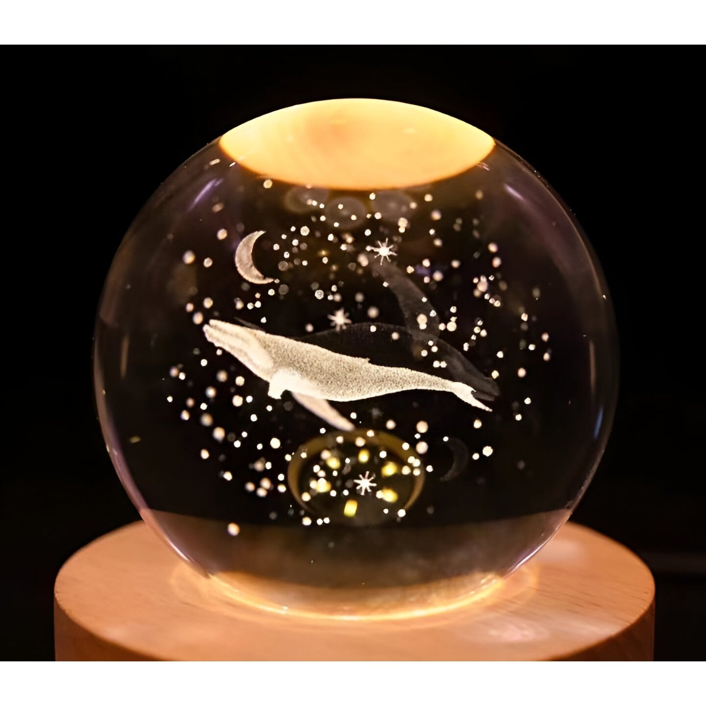 Lampa LED Decorativa, Flippy, cu Bila de Cristal cu Diametru 6cm, Model Balena 3D, Alimentare USB, Suport din Lemn, Lumina Alb Cald