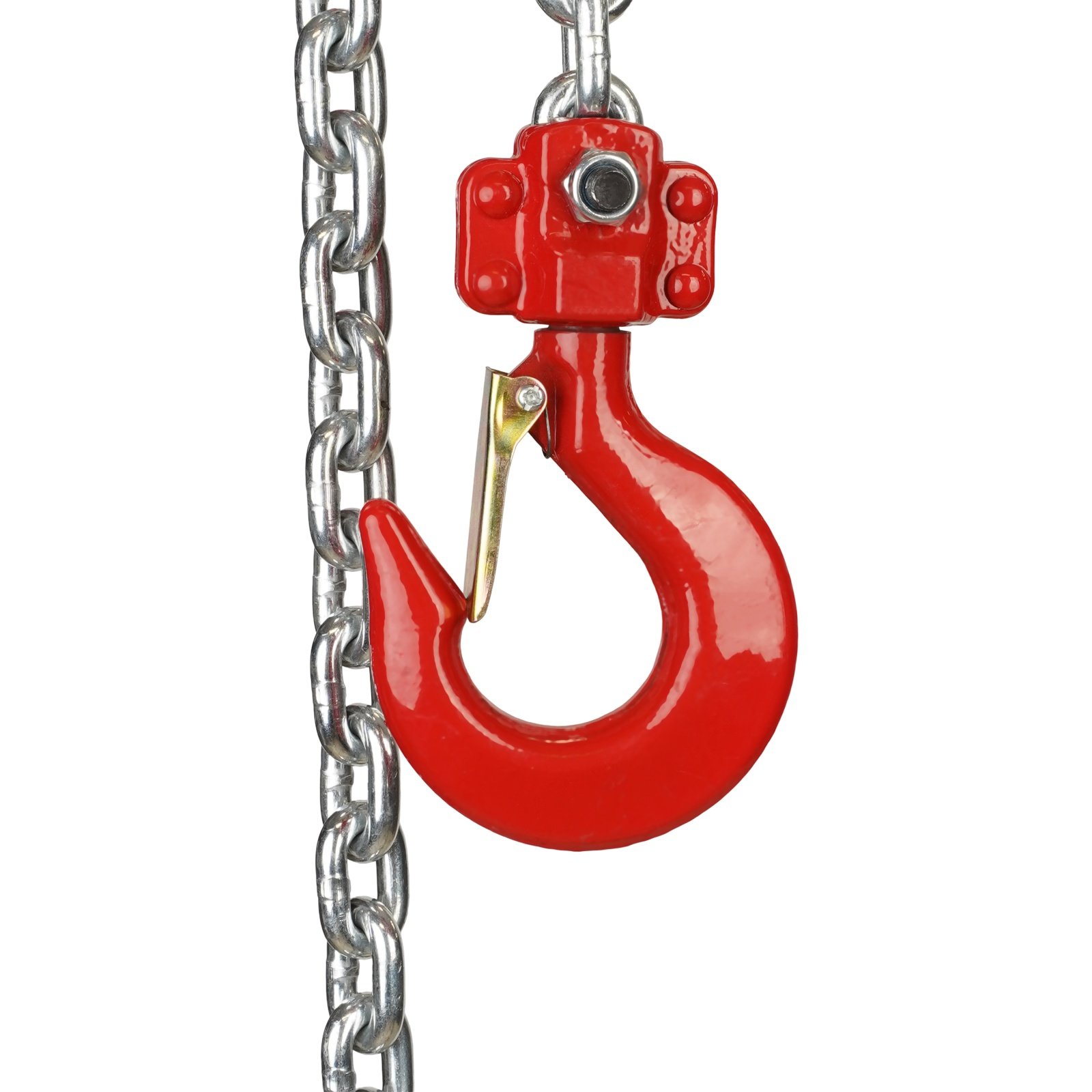 Dispozitivul este dotat cu un lanț industrial de 8×24 mm, realizat din oțel aliat de înaltă calitate, conceput pentru a rezista la tensiuni extreme și la utilizări repetate. Lungimea lanțului de 150 cm este ideală pentru majoritatea aplicațiilor profesionale, permițând ridicarea materialelor grele la înălțimi suficiente pentru instalare, deplasare sau manipulare sigură. Sistemul de frânare automat integrat blochează sarcina în orice poziție, asigurând o fixare fermă și prevenind mișcările necontrolate sau coborârea accidentală.