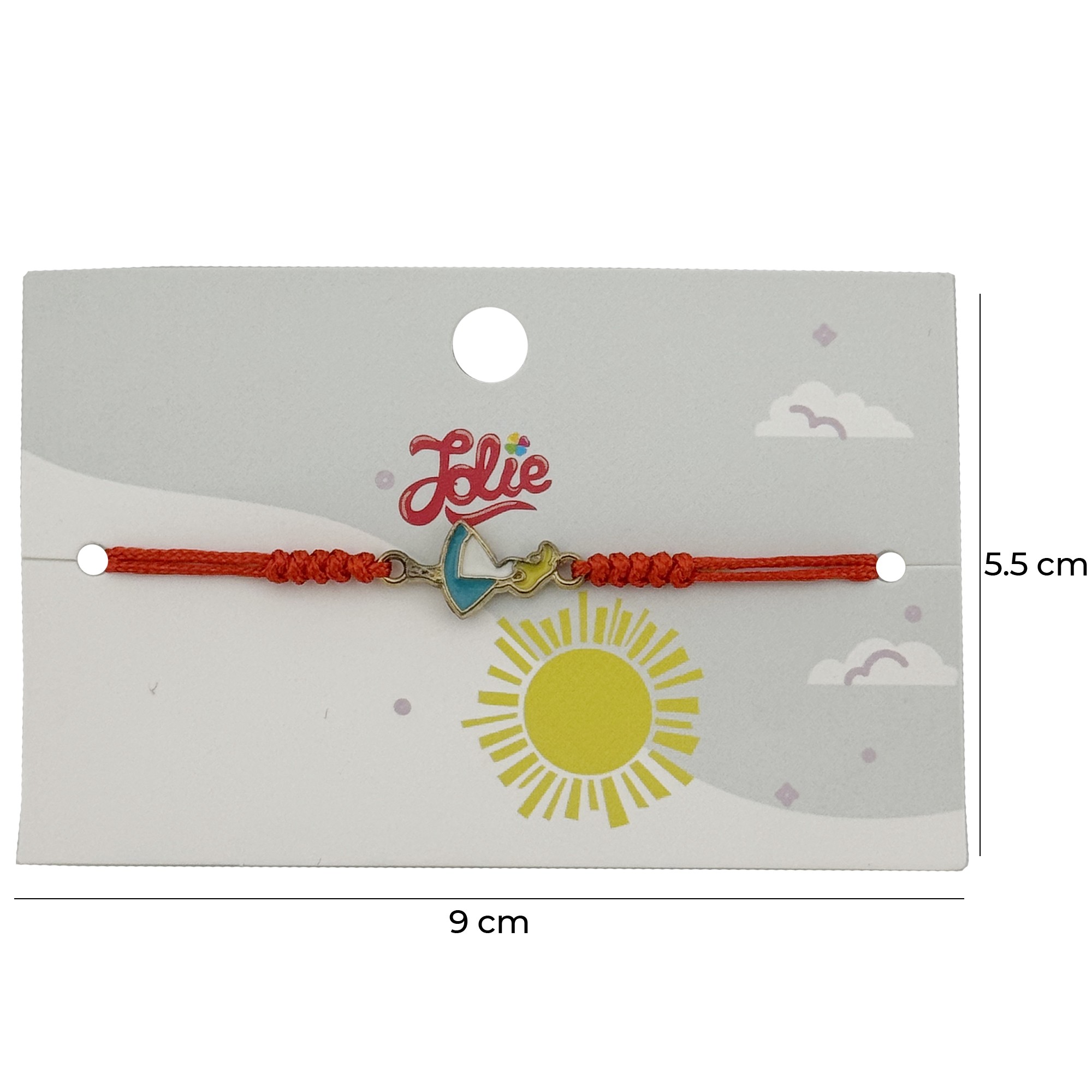 Bratara este realizata cu un pandantiv din metal auriu, decorat cu petale multicolore, atent finisate pentru un aspect atragator. Snurul impletit rosu este reglabil, oferind confort si potrivire usoara pentru incheietura copiilor.
