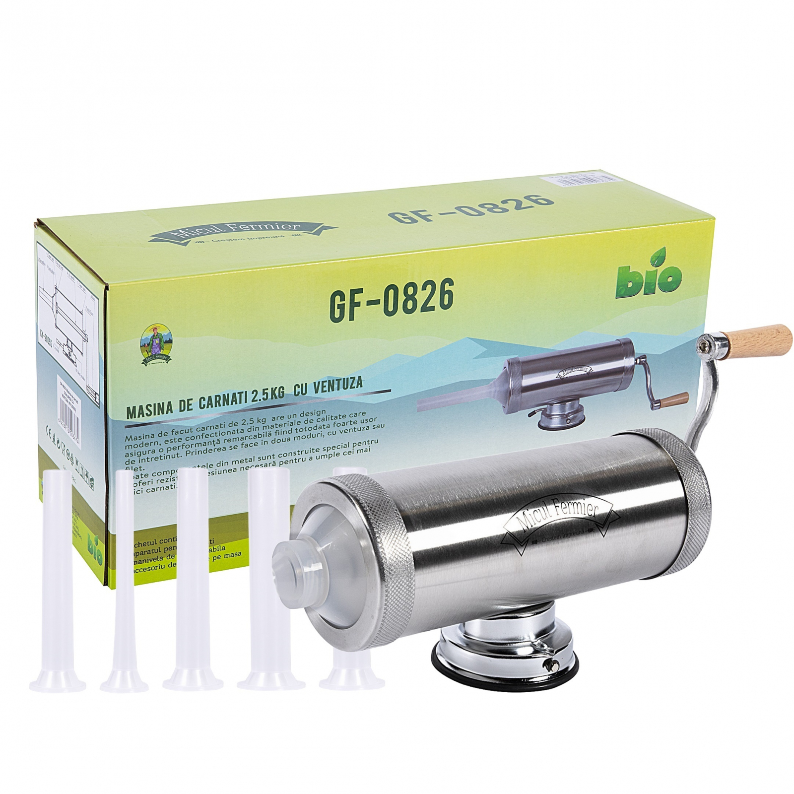 Masina de carnati cu ventuza, 2,5kg, inox Micul Fermier GF-0826 are un design modern si este confectionata din materiale de calitate care asigura o performanta remarcabila fiind totodata foarte usor de intretinut. Constructia masinii este preponderent realizata din aluminiu dur si inox pentru a oferi rezistenta inalta la presiunea necesara umplerii carnatilor si respectarii normelor de siguranta alimentara. Cilindru inoxidabil permite umplerea rapida cu o cantitate mare de carne si la final se poate curata si spala foarte usor.