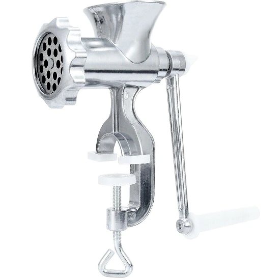 Echipati-va complet bucataria cu un produs ce nu tebuie sa lipseasca niciunei gospodine: Masina de tocat manuala metalica NR. 5! Realizata din aliaje de metale de calitate, masina manuala pentru tocat carne NR. 5 se distinge prin forma deosebita, materialele utilizate pentru realizare, usurinta in utilizare, suprafata stralucitoare si fina. Structura simpla si eficienta ajuta prepararea carnurilor si legumelor la o calitate ridicata si intr-un timp scurt. Masina de tocat metalica NR. 5 este un produs ideal nu numai pentru tocarea carnii, ci si pentru tocarea legumelor sau a fructelor pentru gem, dulceata etc.