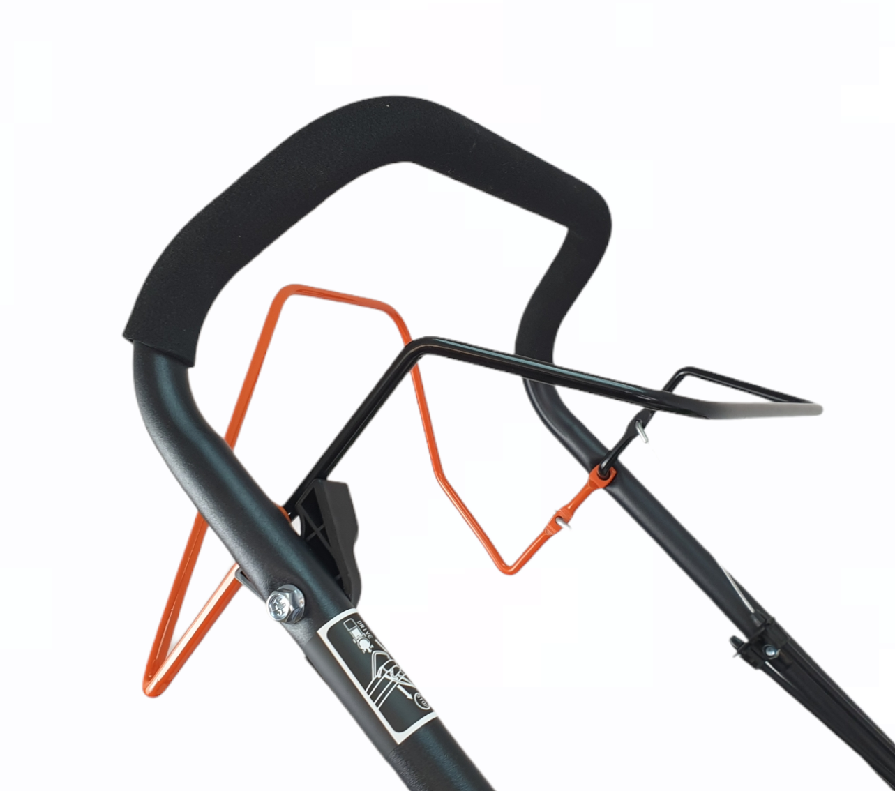 Mecanizmul de cuplare (culoare gri, intre rotile din spate) este activat imediat ce actionati maneta portocalie din poza de sus. Pentru a folosi optim masina de tuns gazon Procraft PLM460 actionati atat maneta neagra (acceleratia) cat si cea portocalie.