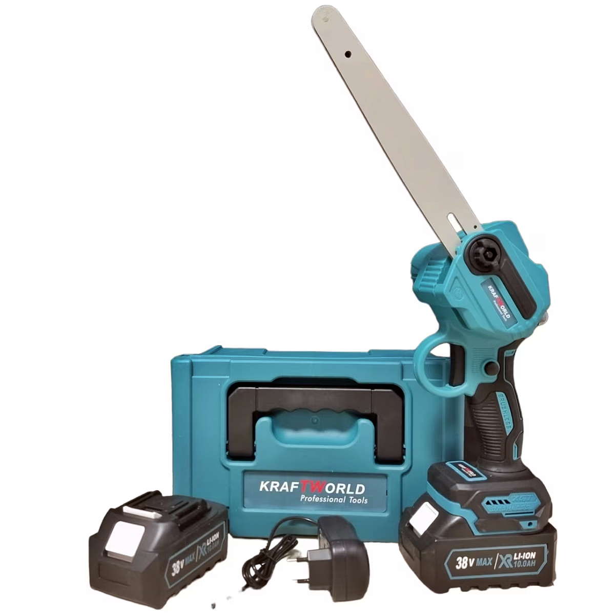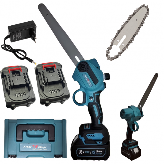 Mini-drujba KraftWorld este un echipament eficient si portabil, perfect pentru sarcini mici de taiere in gradina sau pe teren. Cu o putere de 38 V si doua acumulatori Li-Ion cu o capacitate de 10.0 AH fiecare, aceasta mini-drujba ofera suficienta energie pentru a taia cu usurinta prin ramuri si crengi. Este echipata cu doua lanturi pentru rezerva, asigurand astfel ca veti avea intotdeauna un lant pregatit pentru utilizare.