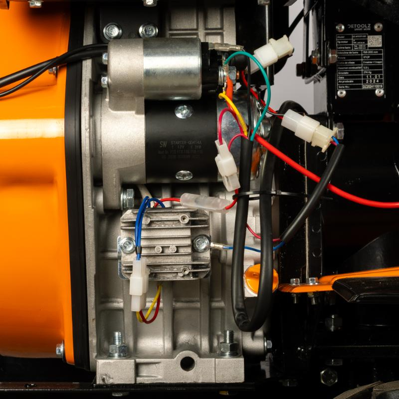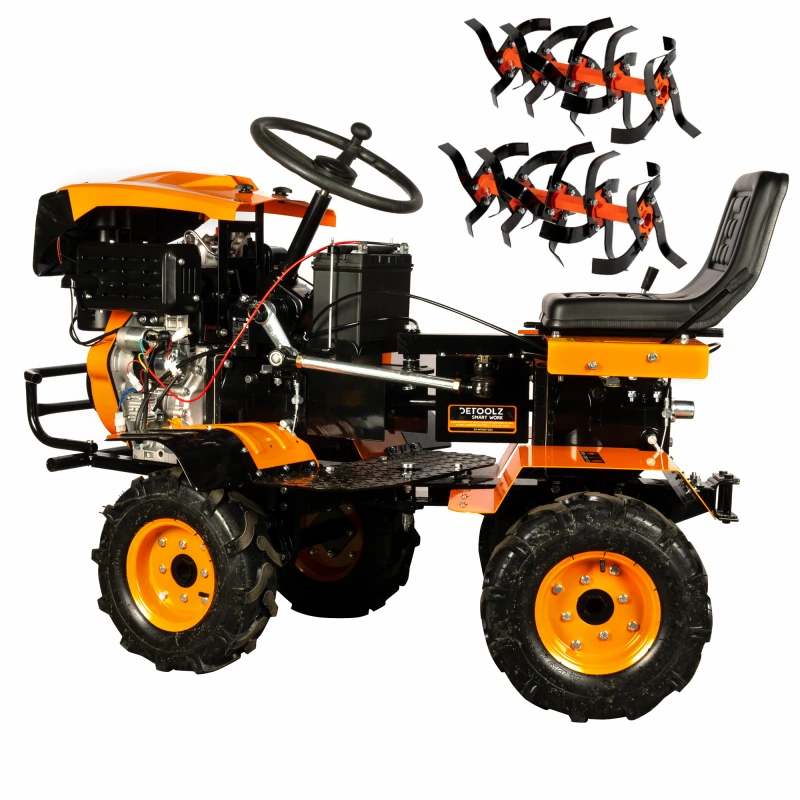 Mini tractor 17CP 530cc motorina 4T 4x4 cu 4 viteze si pornire electrica, model DZ-MT1007-G02 are dimensiuni reduse, este usor, multi-functional si foarte eficient in procesul de pregatire a solului pentru cultivare. Este echipat cu un motor in 4 timpi, monocilindru, OHV racit cu aer fortat, cu o capacitate cilindrica de 530 CC, dezvoltand o putere de 17CP si aprindere prin compresie MAC/Diesel.