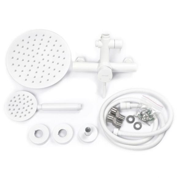 Coloana de dus Mixxus SUS-003-J ALB, 120 cm baterie si para, monocomanda, furtun flexibilColoana de dus cu baterie si para de dus.Fabricata din alama cu strat decorativ aplicat la temperaturi inalte. Culoare Alb impecabil. Nuanta mat. Textura lina Teava telescopica 95 cm - 136 cm Capul de dus (palaria) poate fi inclinata circular in orice directie Distanta dintre gaurile de legatura cu tevile din perete - 150 mm ( masurat de la mijloc la mijloc) Lungimea totala de la teava orizontala la baza bateriei de dus - 136 cm Diametrul palniei de dus P mare - 200 mm/ P mica - 100 mm Lungime furtun 1400 mm Grosimea tevei de dus 25 mm