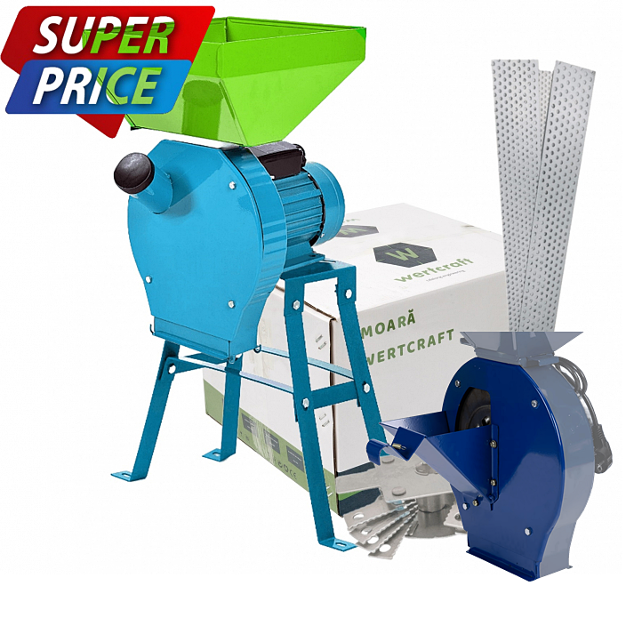 Moara Wertcraft cuva mare cu suport 3.5 Kw, 2850 Rpm, 4 site,20 ciocanele,capacitate maxima de maruntire 350 kg/h,sistem antirefulare,debit reglabil,uruiala,porumb,grau,orz,stiuleti porumb