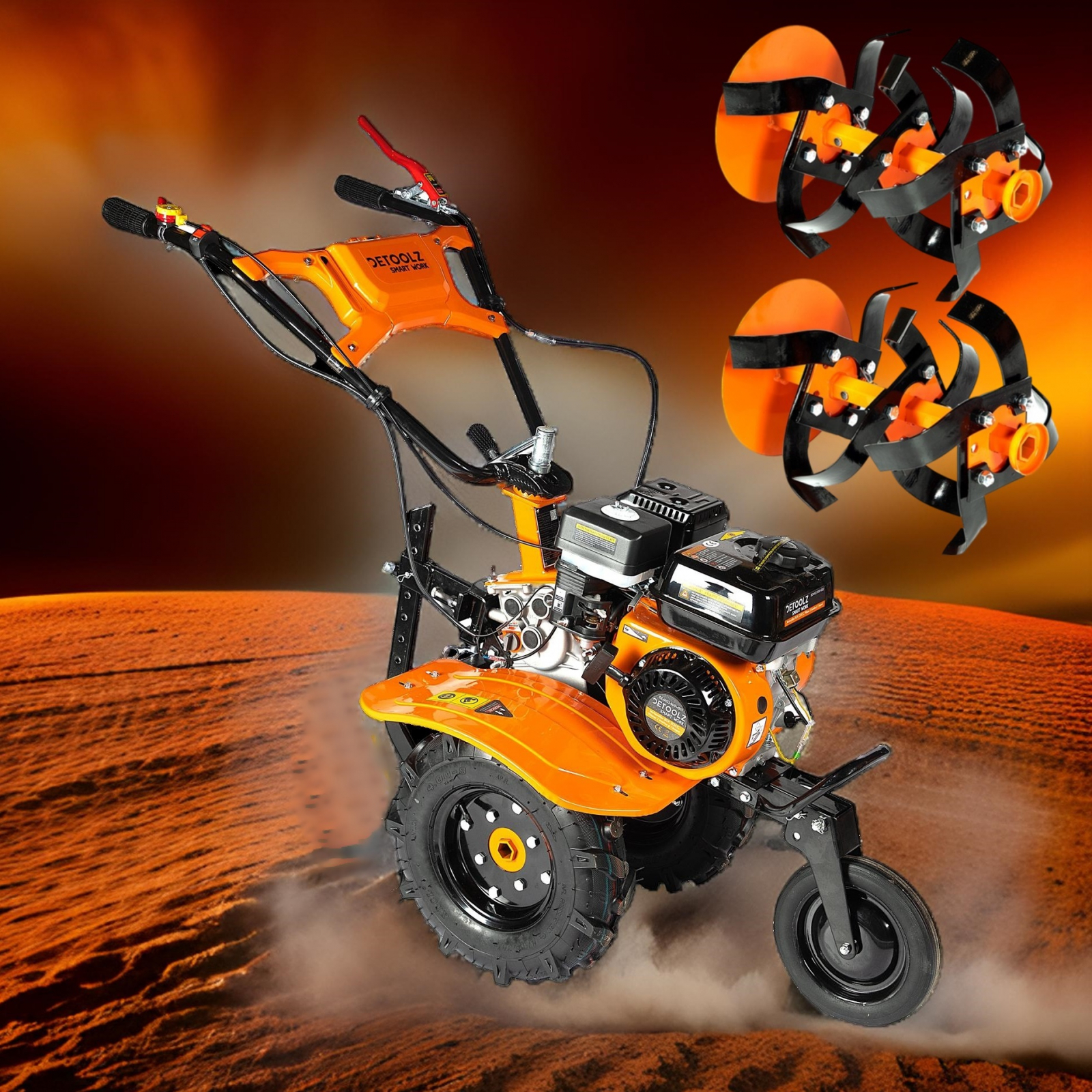 Motocultorul 8CP, 212CC, trei viteze, doua inainte si una inapoi, Detoolz DZ-M122-S001-G02 are dimensiuni reduse, este usor, multi-functional si foarte eficient in procesul de pregatire a solului pentru cultivare. Este echipat cu un motor in 4 timpi, monocilindru, OHV racit cu aer cu o capacitate cilindrica de 212CC, dezvoltand o putere de 8CP si aprindere TCI (Transistor Controlled Ignition). Produsul are o structura simpla, depanarea este usoara si are un consum mic de carburant; este produsul ideal pentru microagricultura.