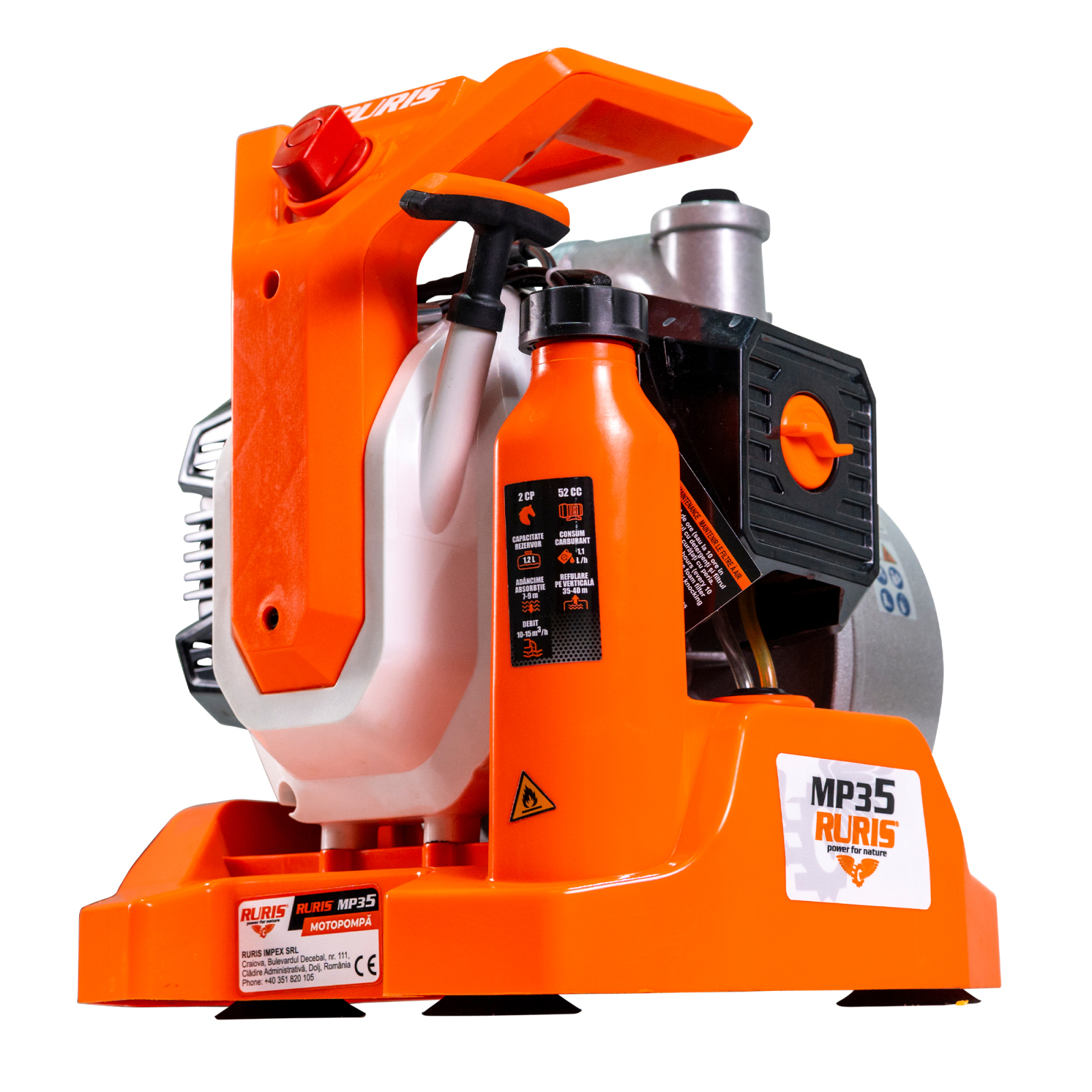 Motopompa RURIS MP35 are un ciclu de functionare in 2 timpi si o putere de 2 CP. Capacitatea cilindrului este de 52 cmc, iar sistemul de aprindere este electric._x000D_